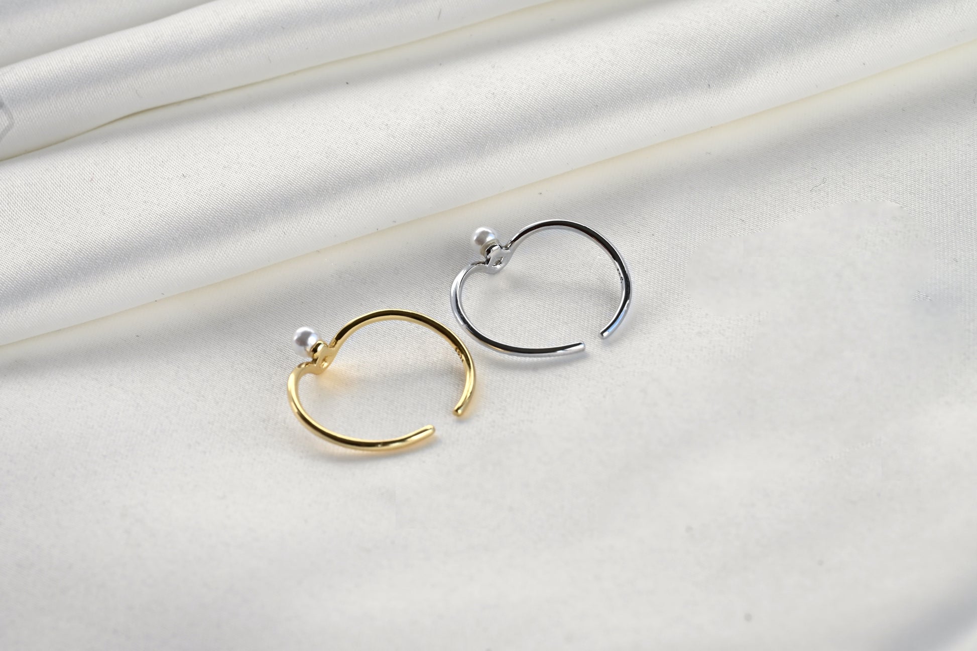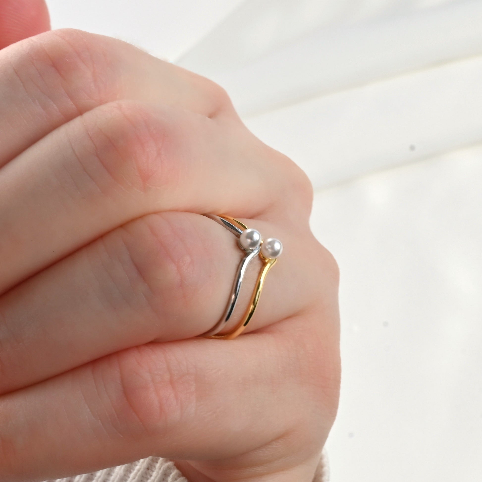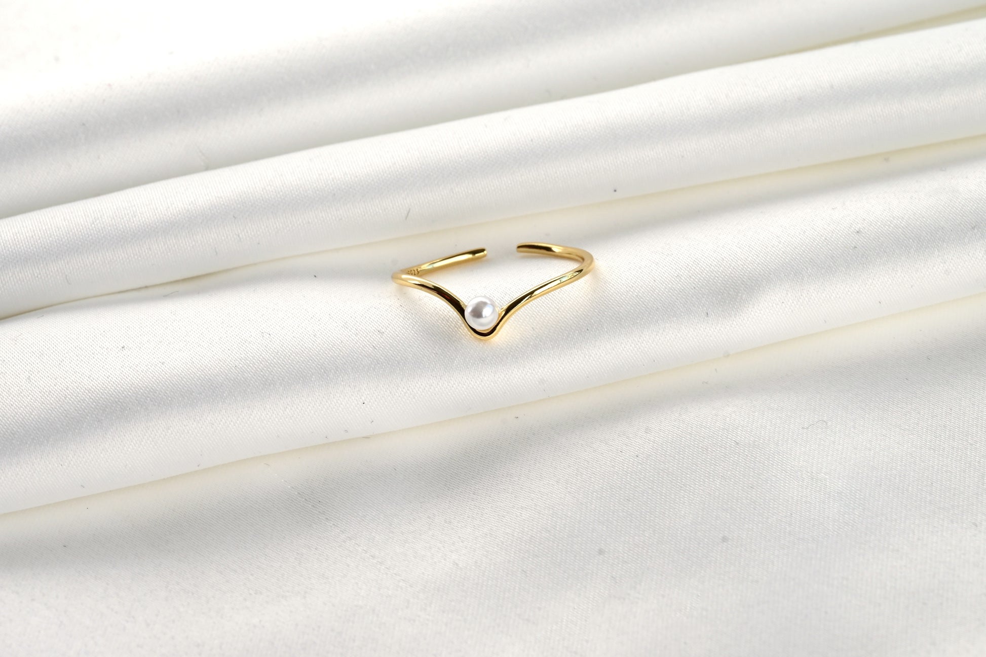 Made in 925 Sterling Silver in silver and 18k Gold Vermeil finish and set with a 3 mm shell pearl, this solo pearl V ring has an open design that offers a versatile use. Mix and match metals for a fun look!