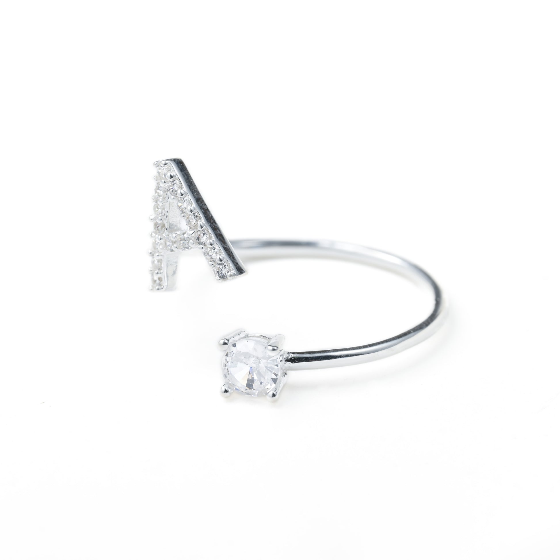 Crafted in sterling silver, our open bypass ring features a letter with CZ stones in a pave setting atop a 5mm diamond. Sized at 8 and easily adjustable, it adds a touch of glamour to any outfit.