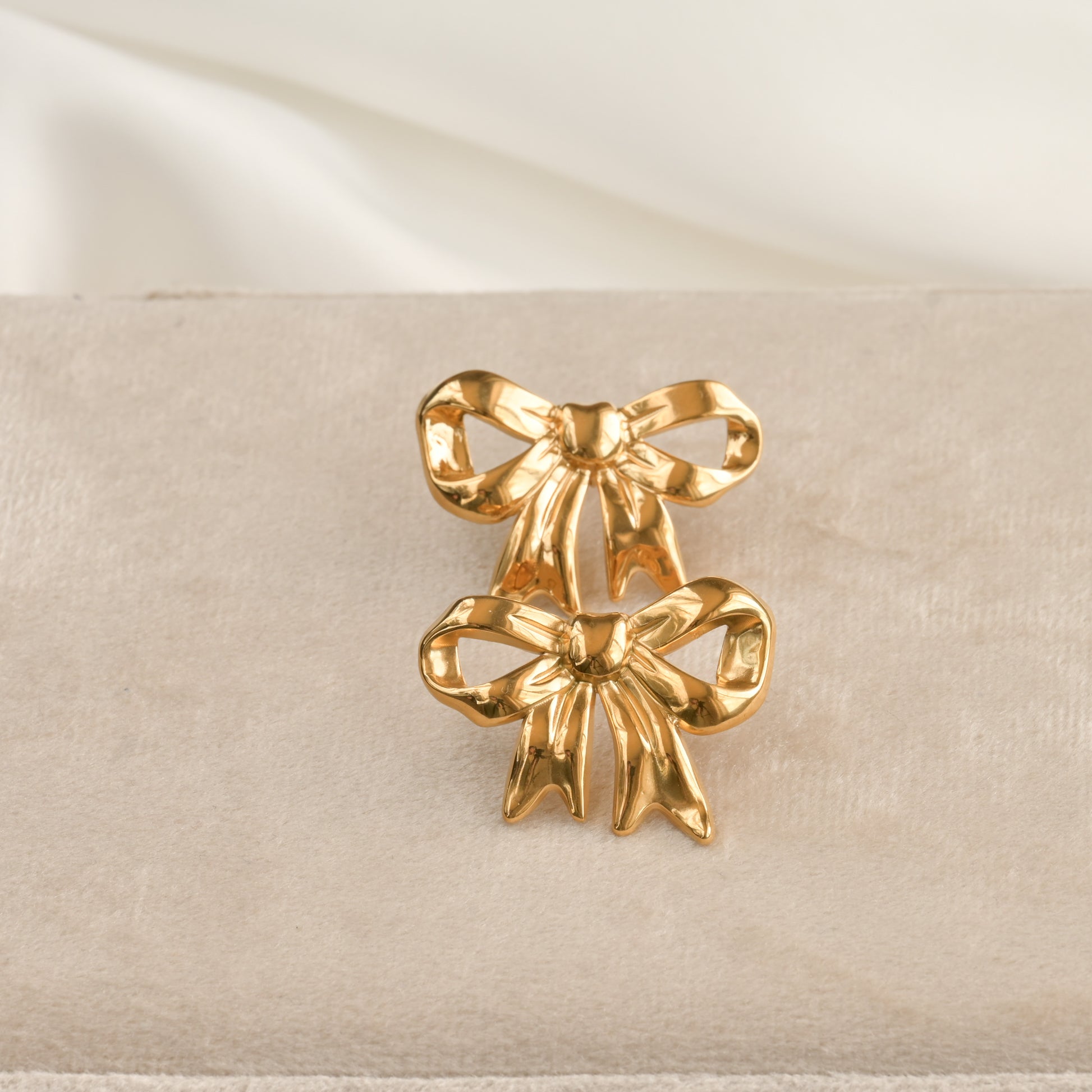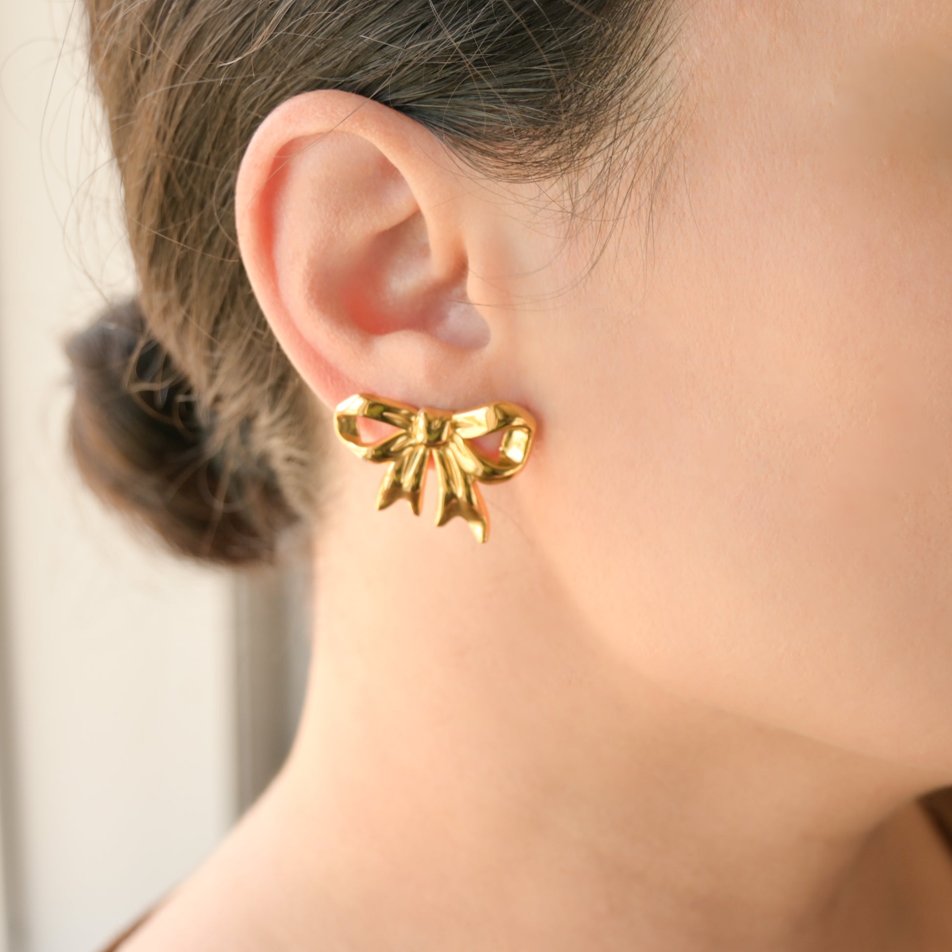The Oversized Bow Tie Earrings are crafted from stainless steel and feature an 18k gold PVD plating. These bold, oversized earrings add a stylish accent to any outfit, making them ideal for both casual and formal occasions.