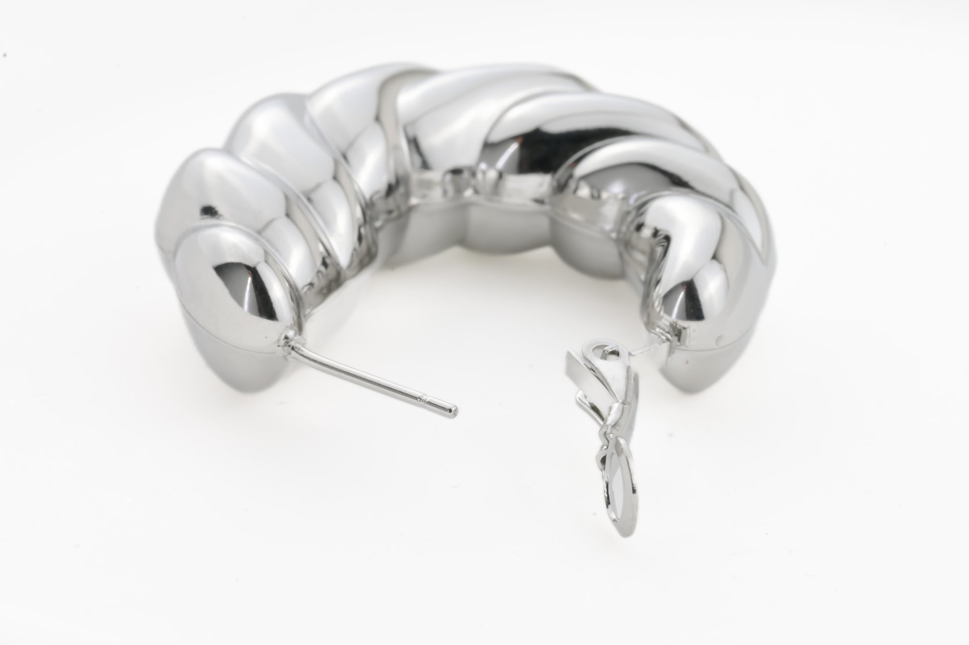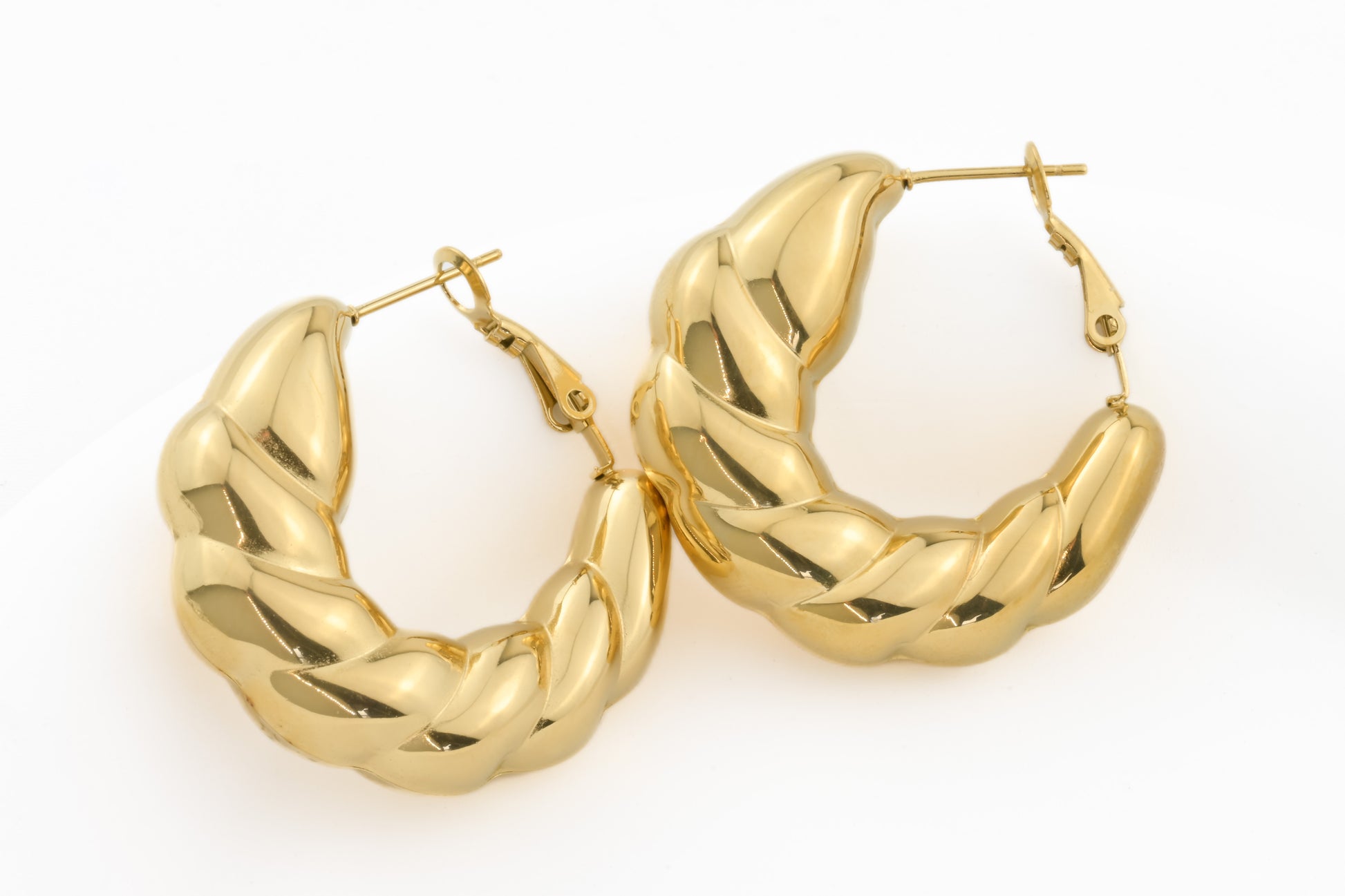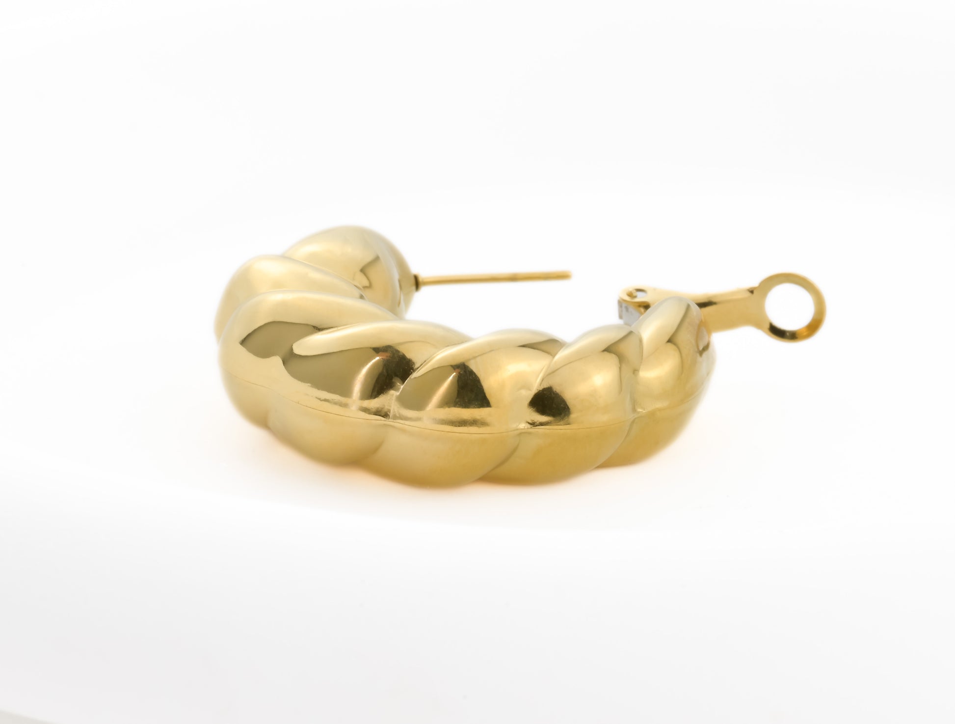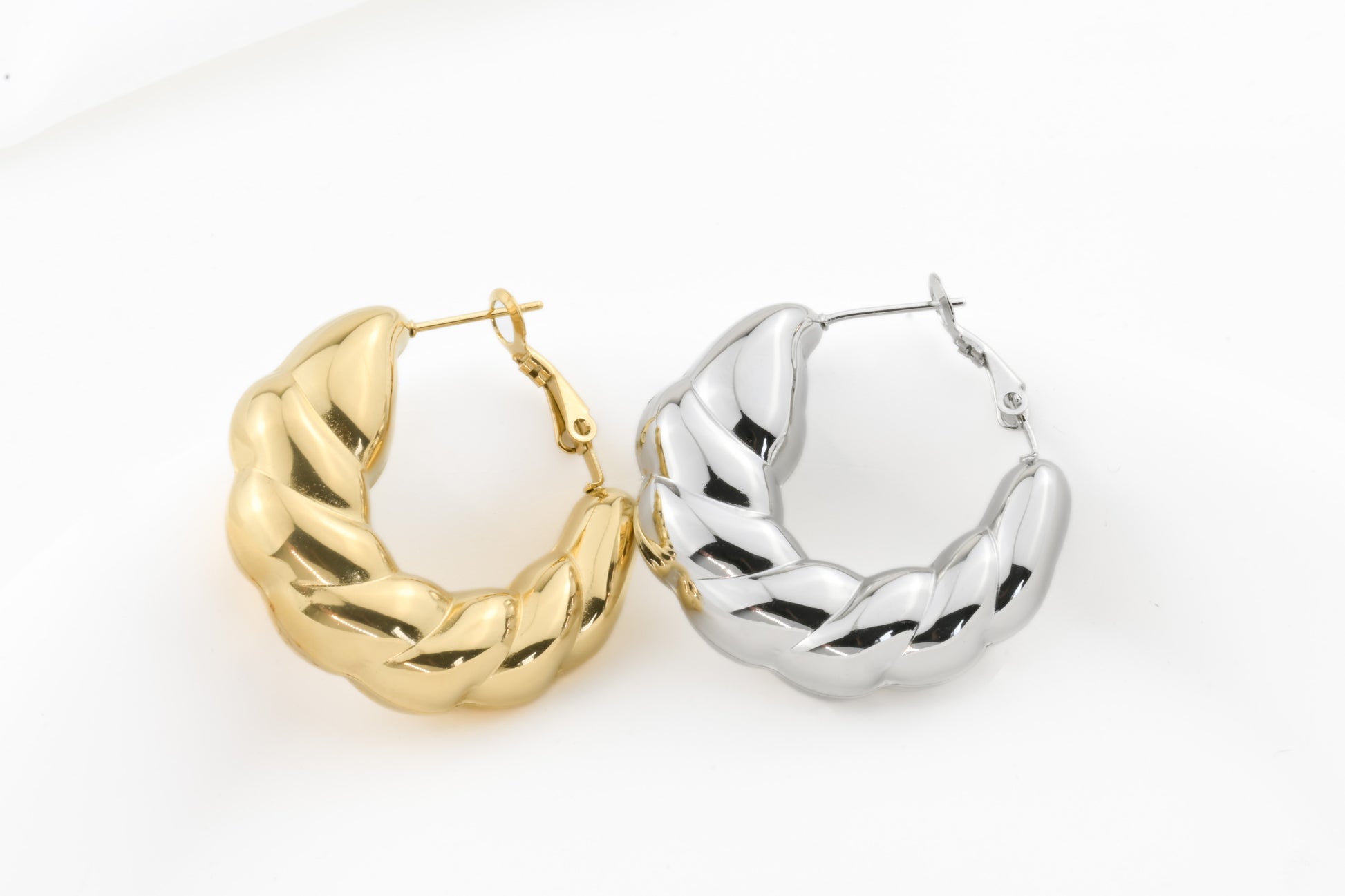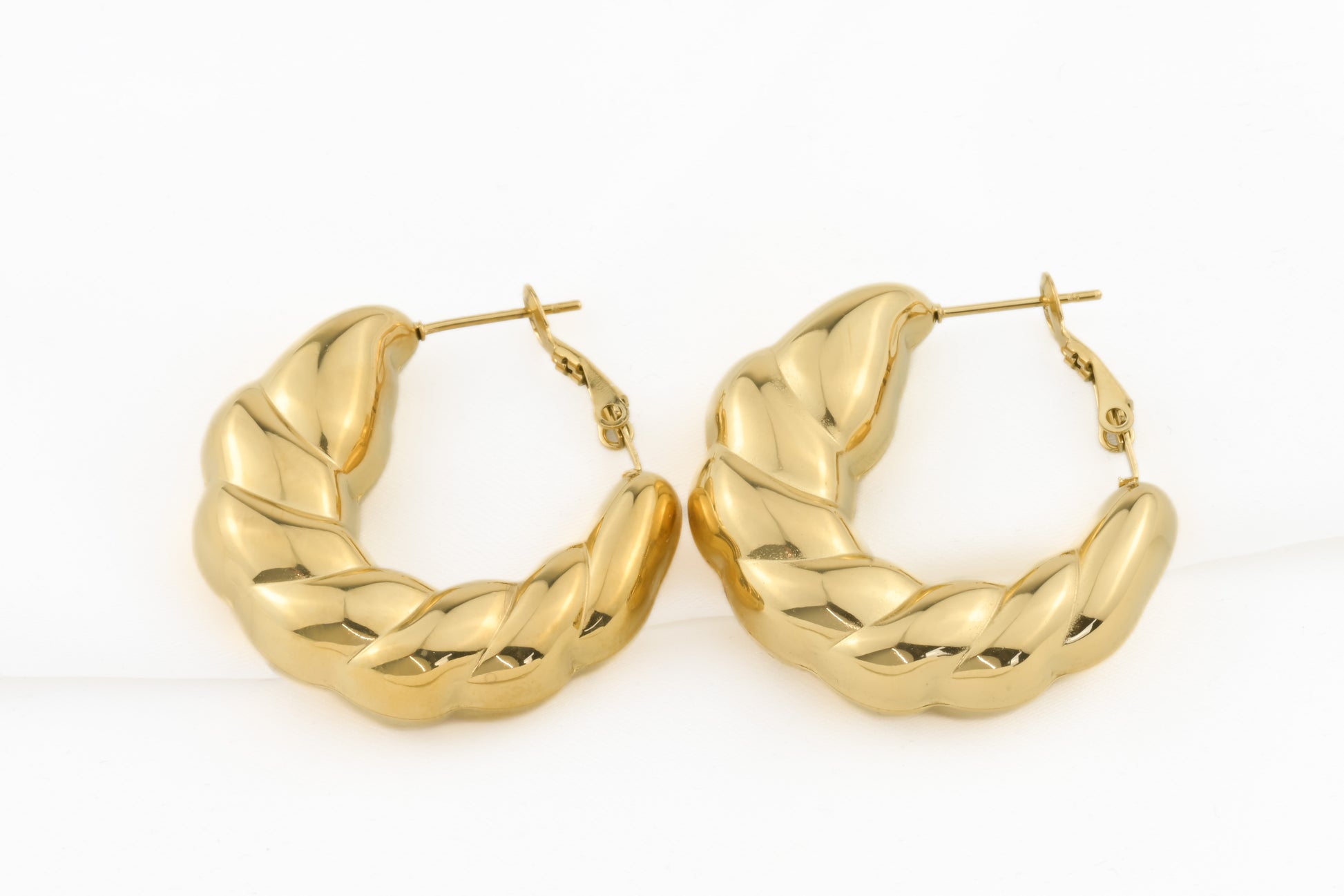 Our Oversized Puffy Twisted Hoop Earrings draw inspiration from the classic croissant shape with a mid-century vintage vibe. Crafted from stainless steel and finished with a 18k gold PVD plating, these earrings exude elegance. Complete with butterfly backs for secure wearing, they are a must-have addition to your jewelry collection.