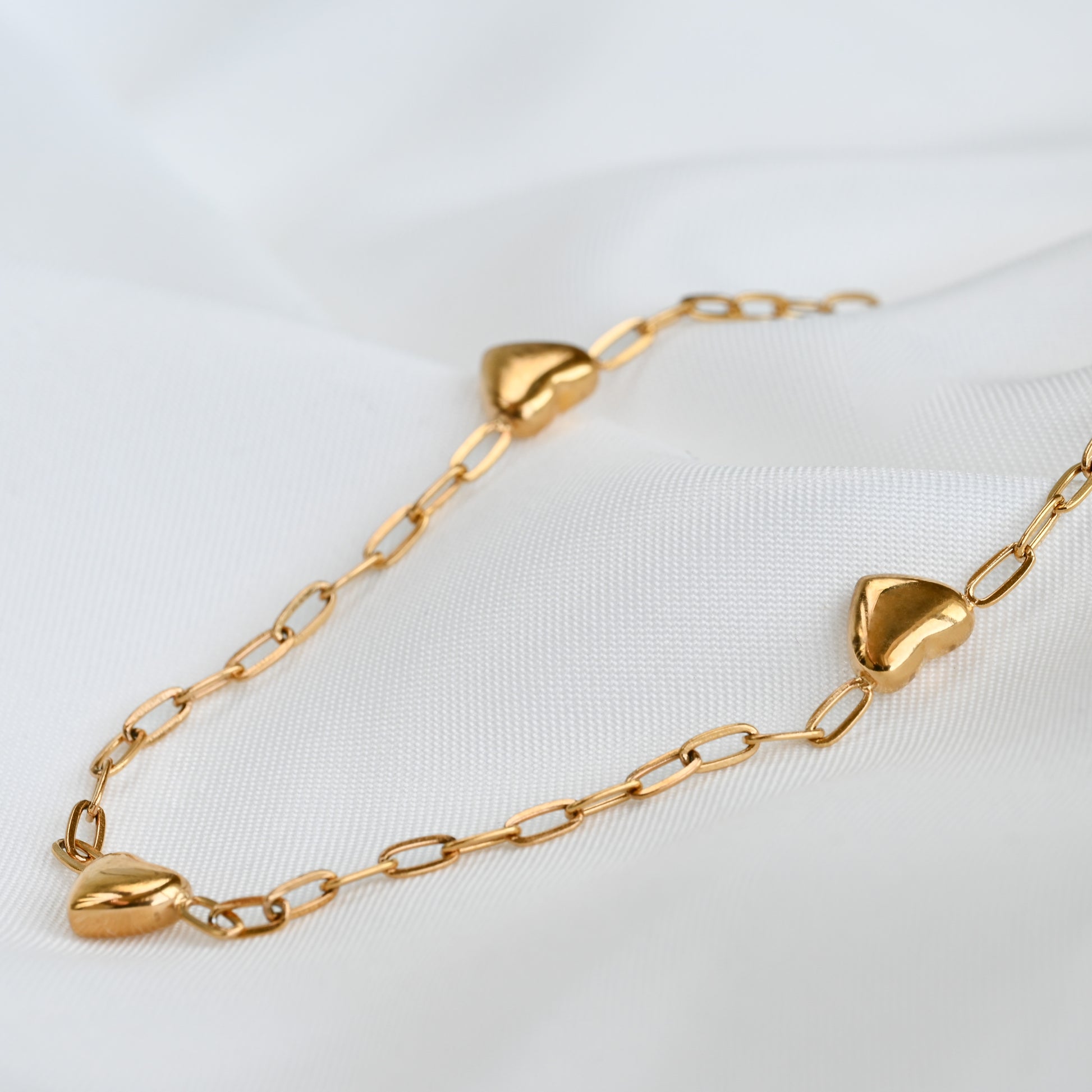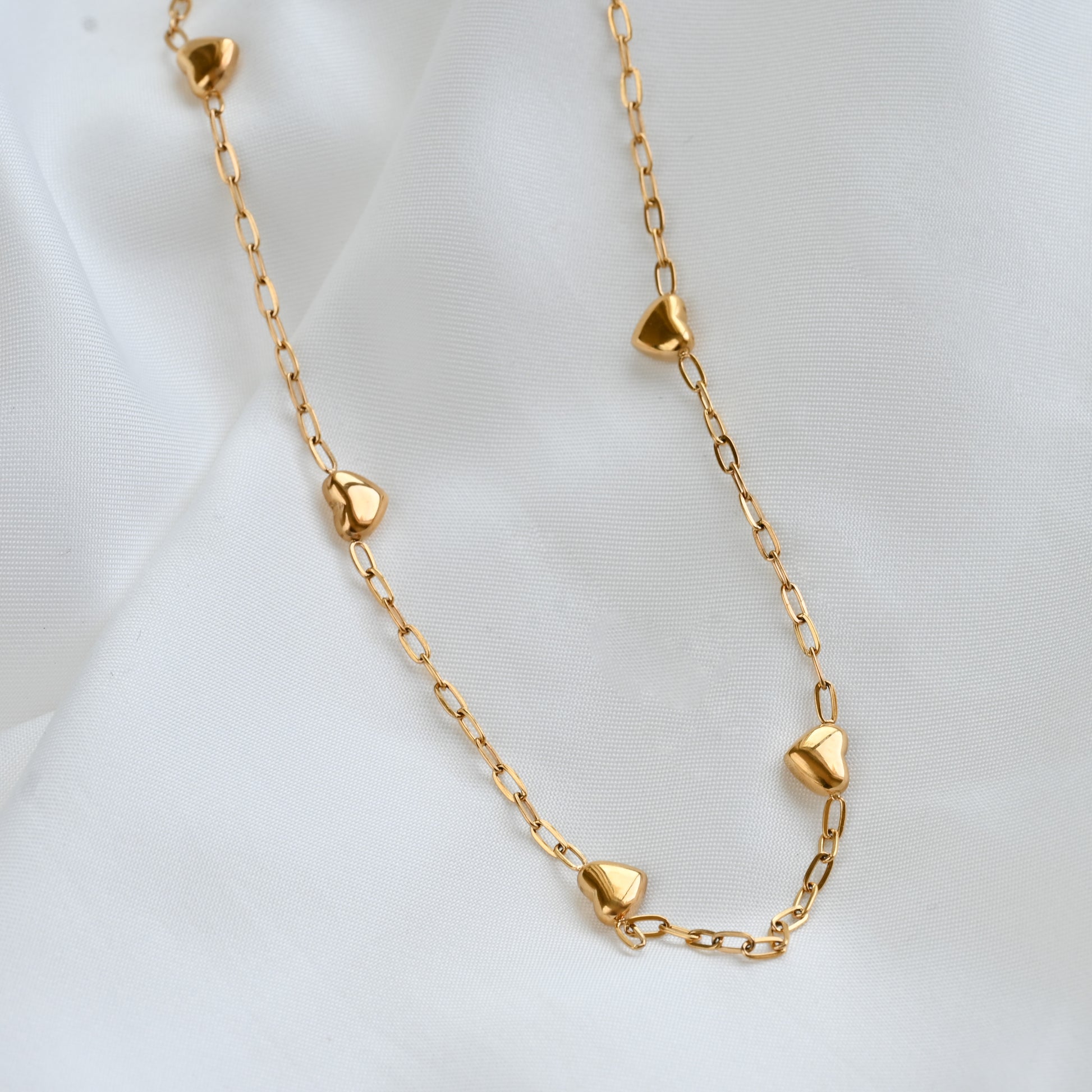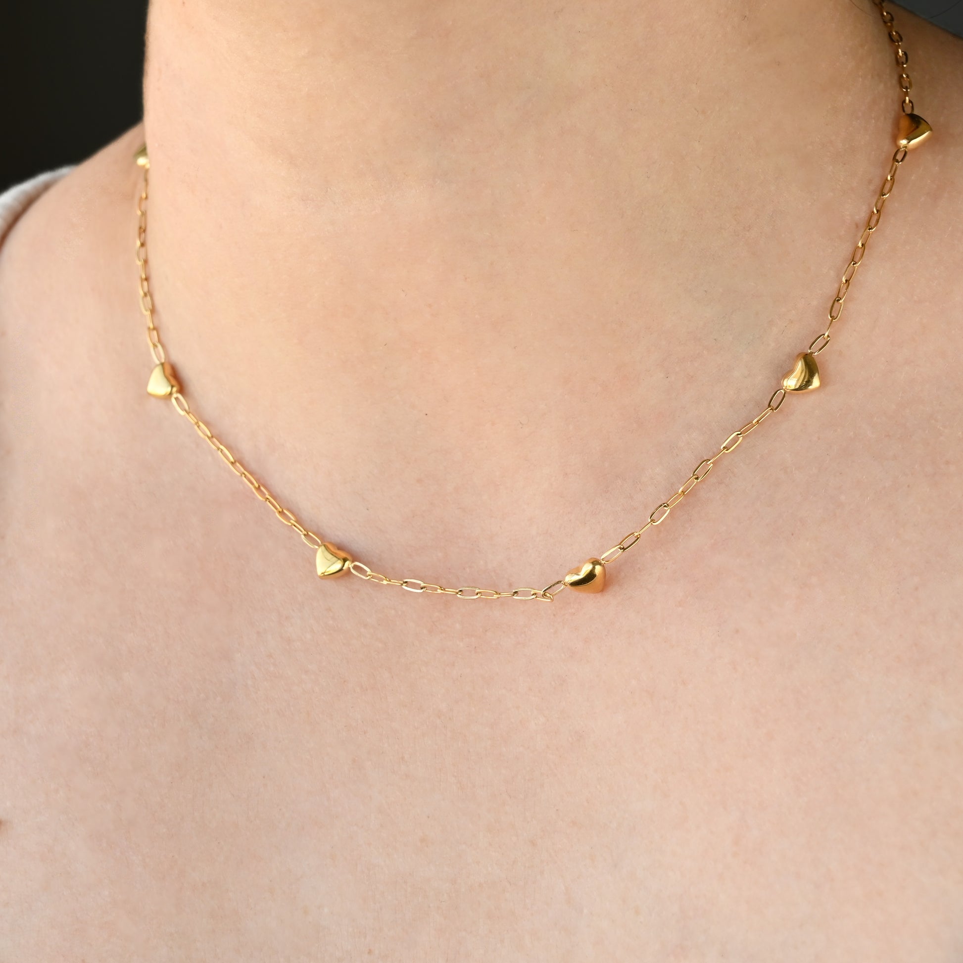 Heart charm necklace on a stainless steel dainty paperclip chain. The chain is 16" with a 2" extender and is waterproof for everyday wear.