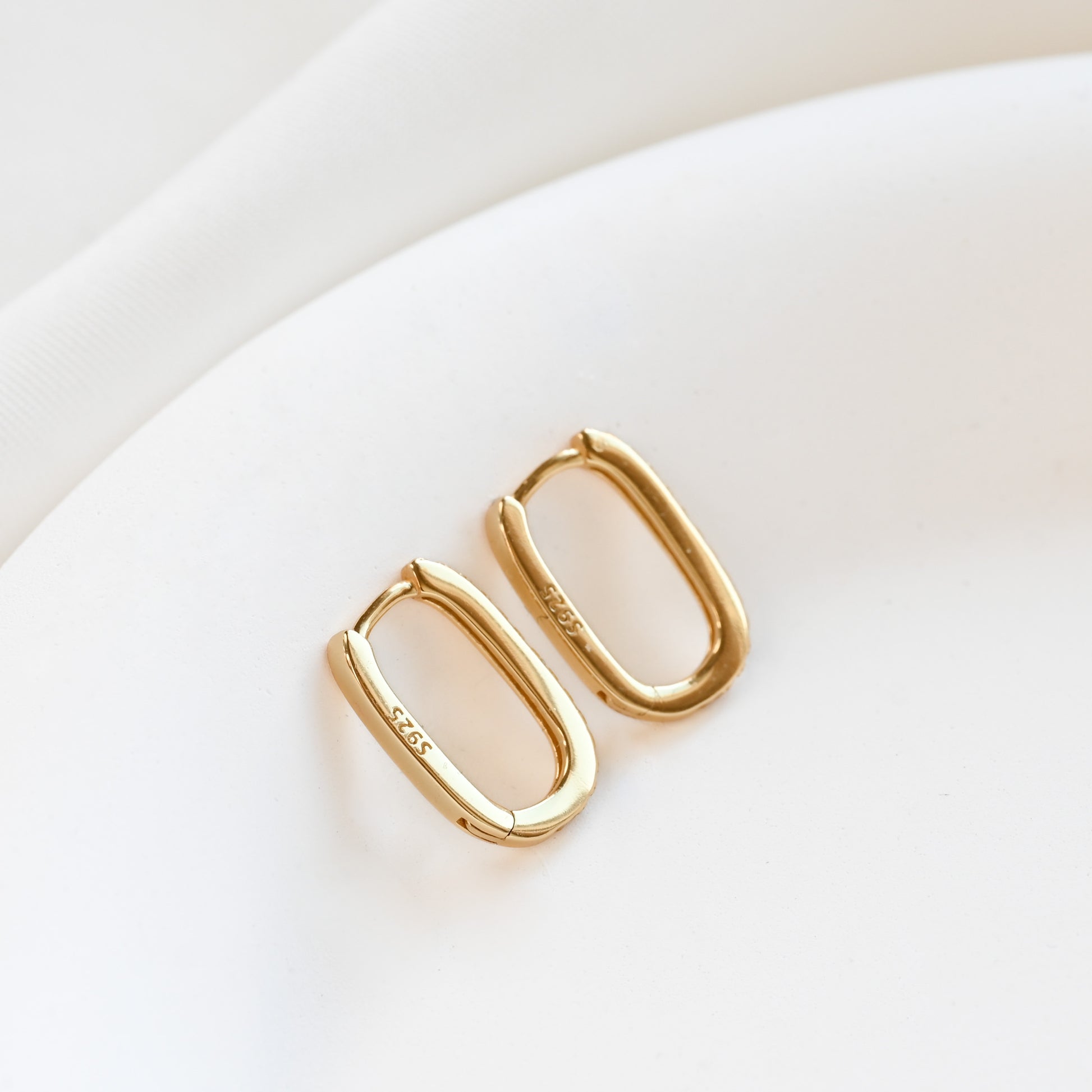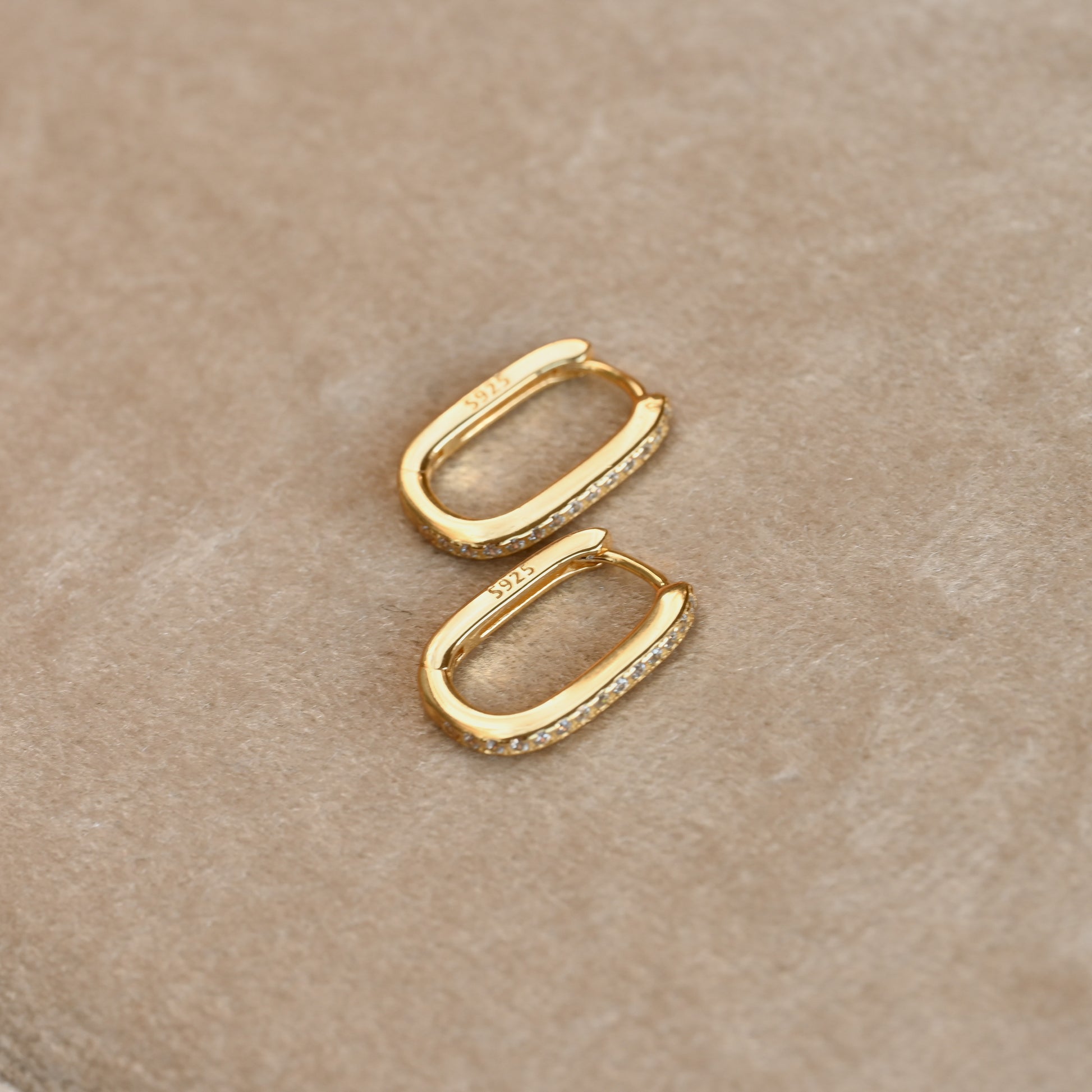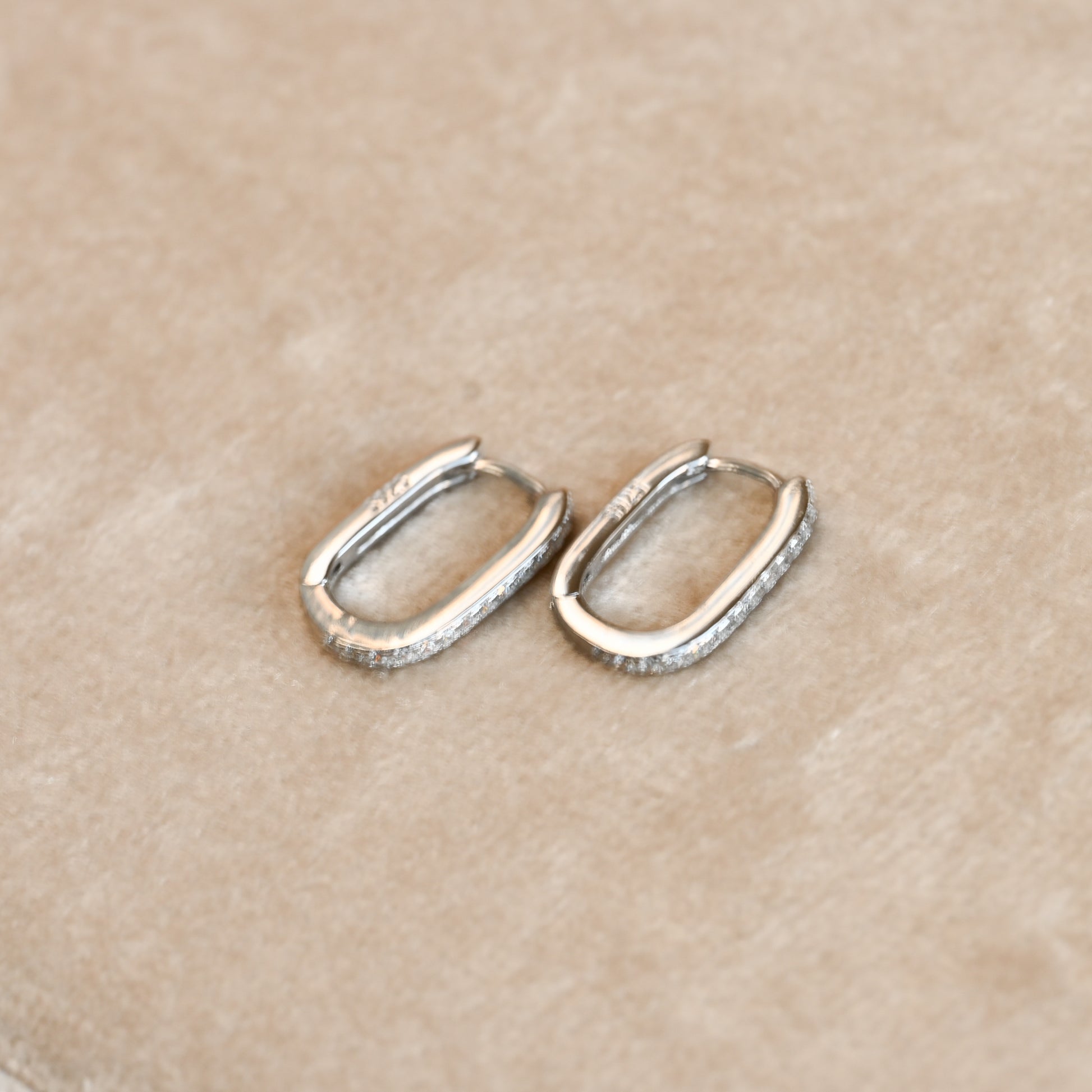Small sterling silver U hoops featuring a half pave cubic zirconia design on the front and a smooth, plain back. These 10x15mm hoops are available in gold or silver finish. Ideal for those searching for pave hoops, small U-shaped earrings, or sterling silver CZ hoops for everyday wear.