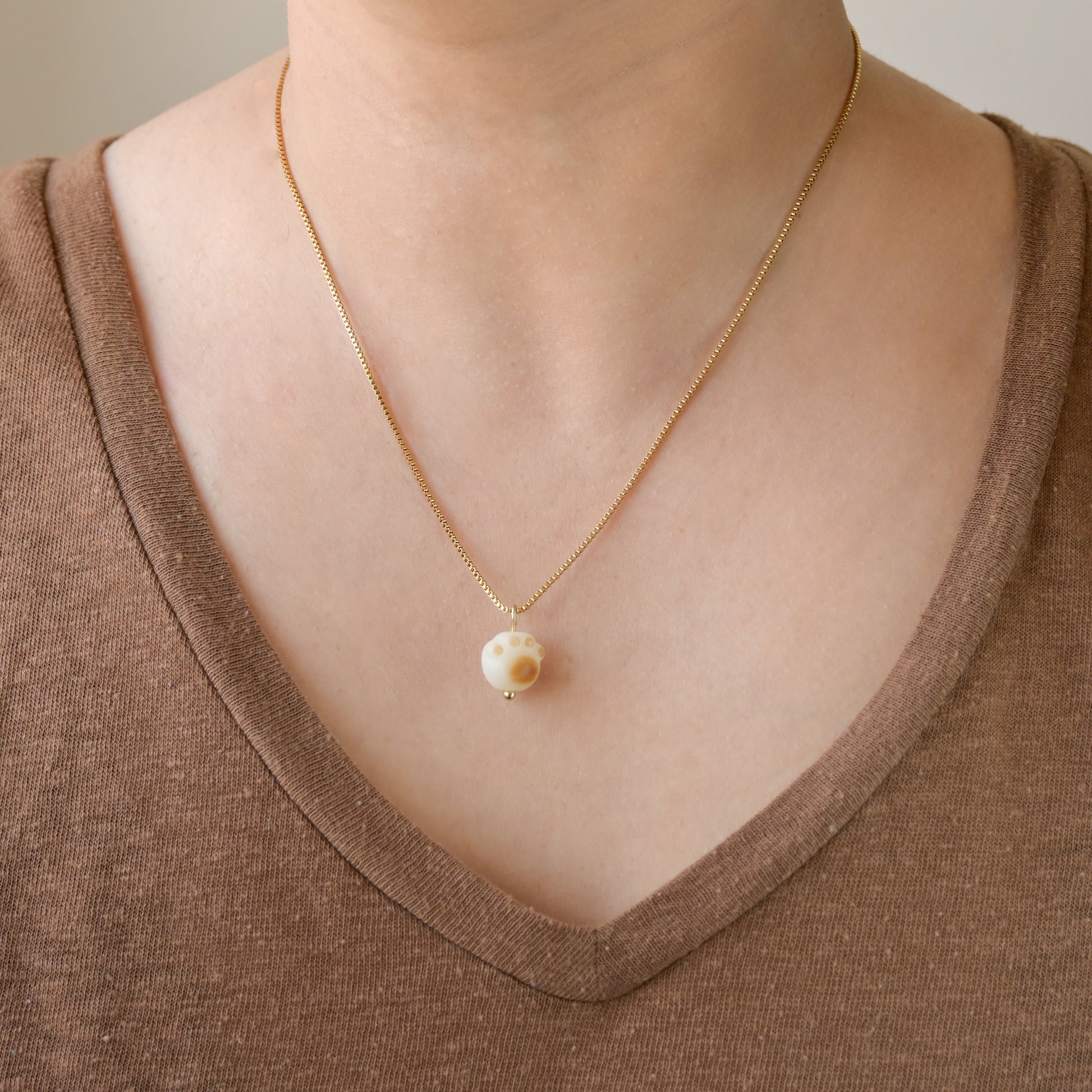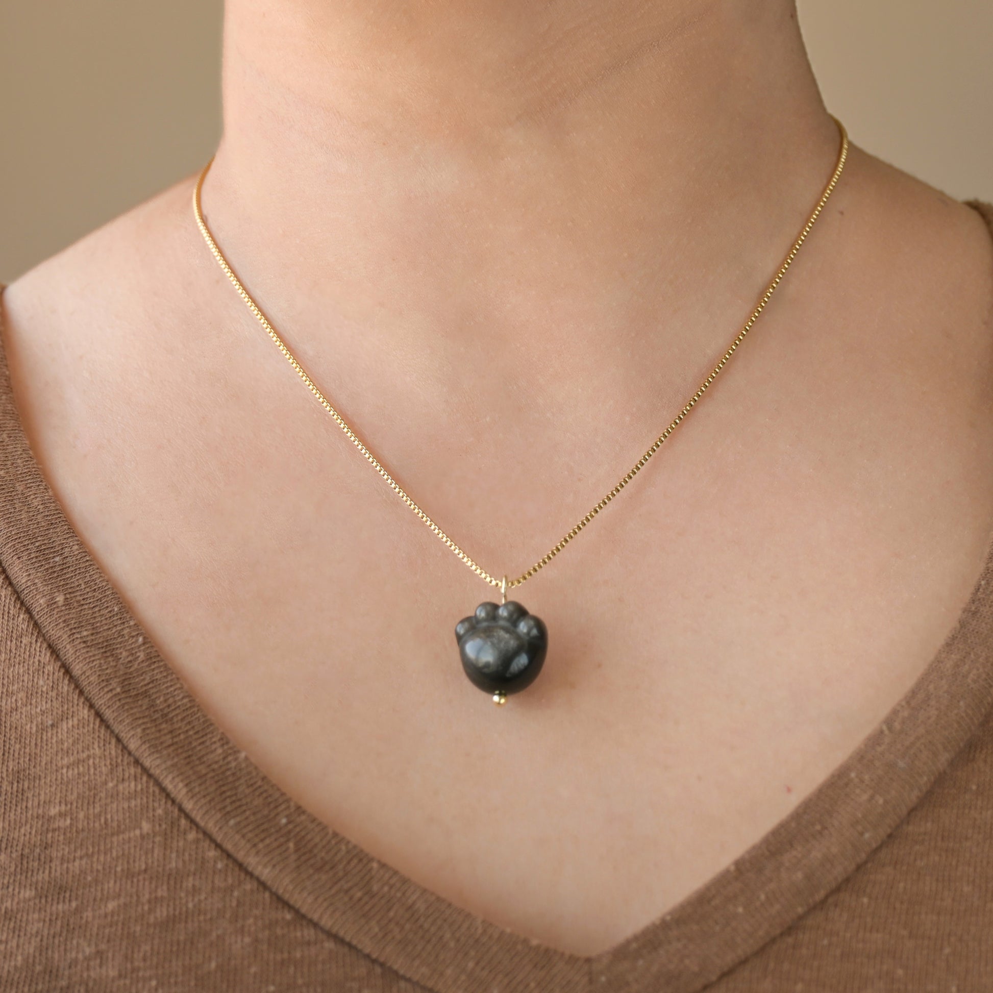 This paw print necklace, made of stainless steel with an 18k gold PVD plated finish, features 13mm white and 16mm black paw print pendants on a 16" dainty box chain with a 2" extender.