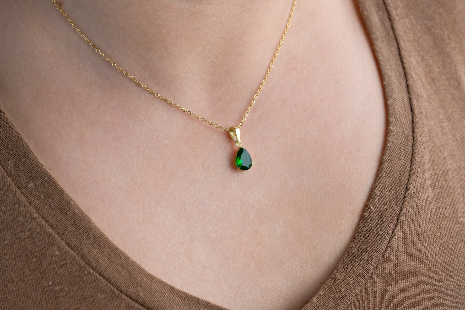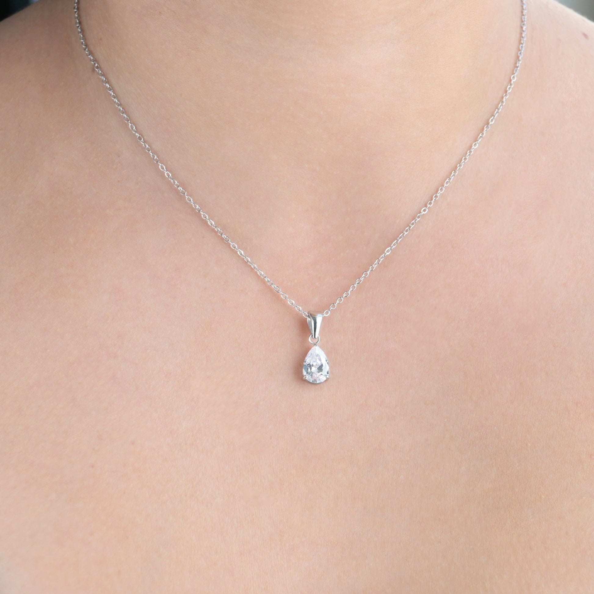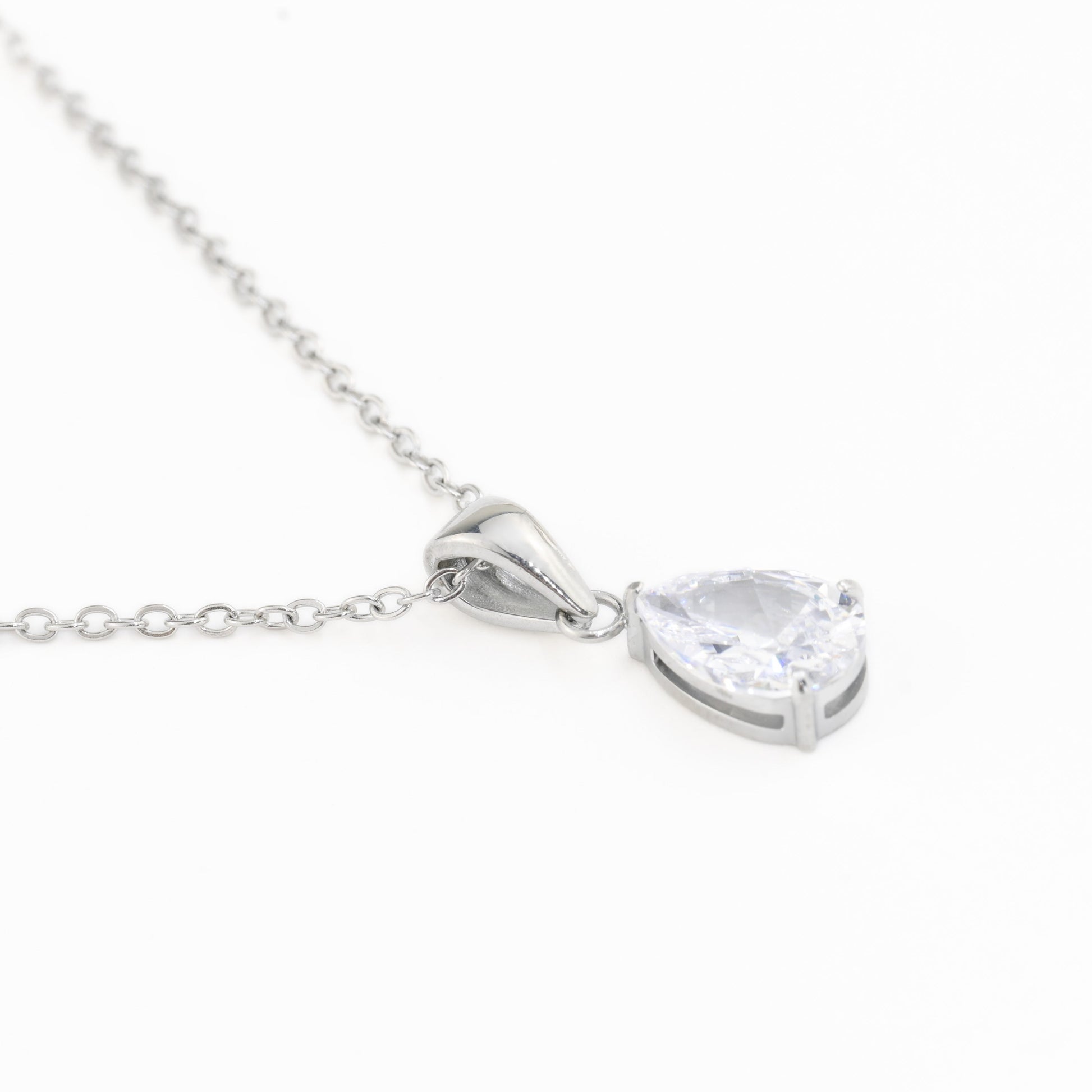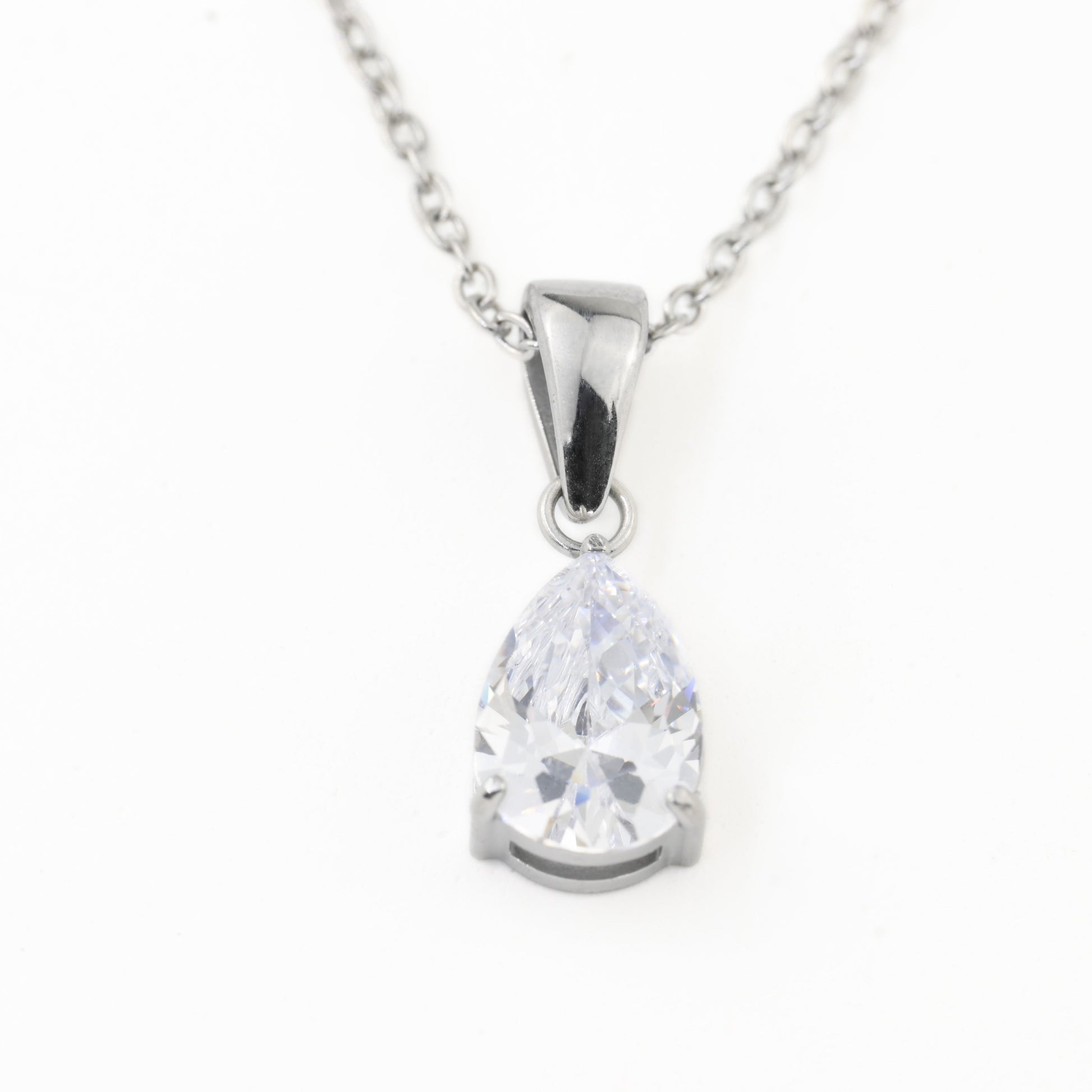 Stainless steel pear diamond necklaces, featuring CZ stones in various colors. Tarnish-free and durable, with an 8x11mm diamond size on a 16" cable chain, adding timeless sparkle to any outfit.