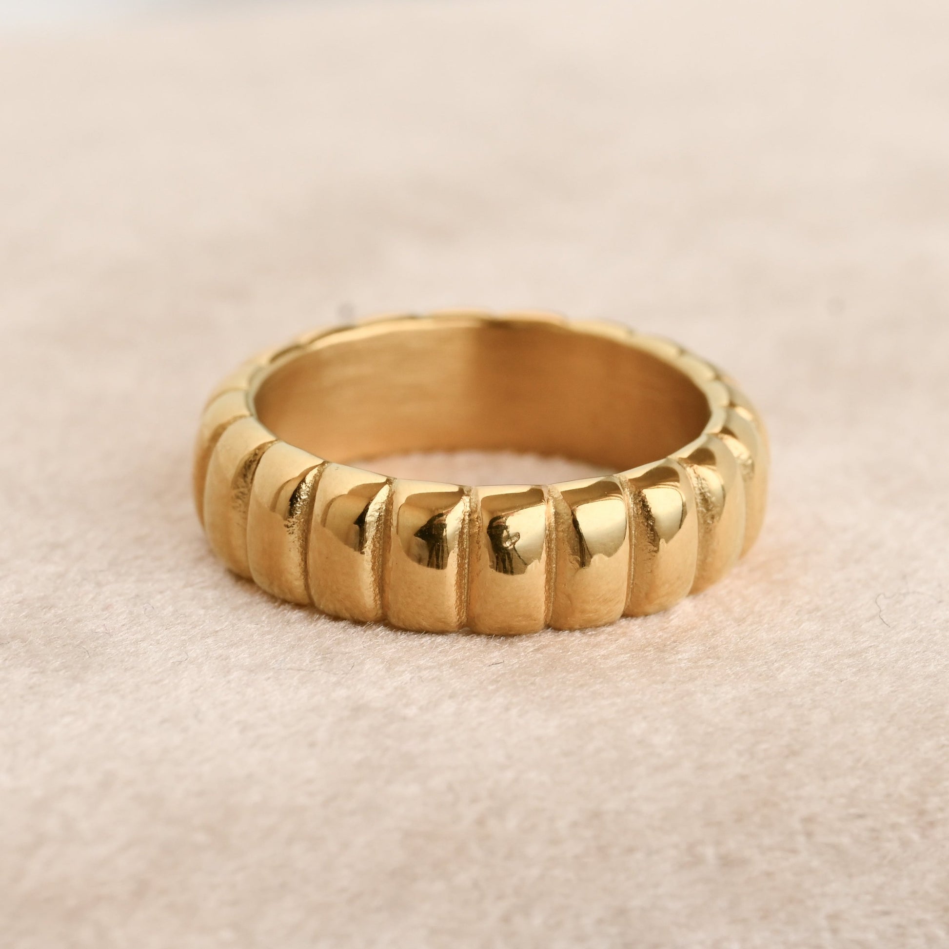 Our Slim and Wide Puffy Rings, crafted from stainless steel and plated in 18K gold, offer a stylish yet durable option. The slim ring is sleek and minimal, while the wide ring adds a bold touch. Perfect for stacking or wearing solo, these rings are versatile for any look.