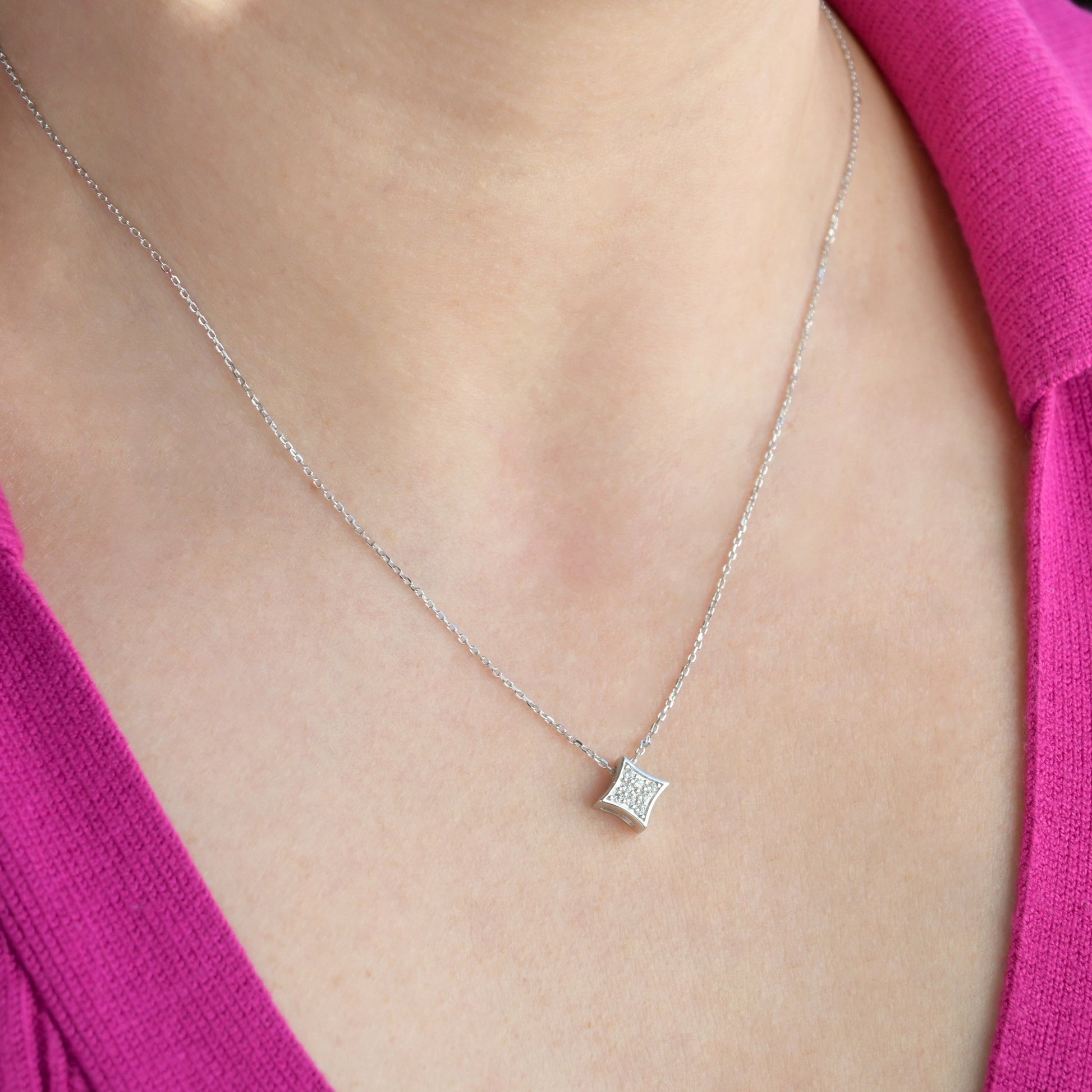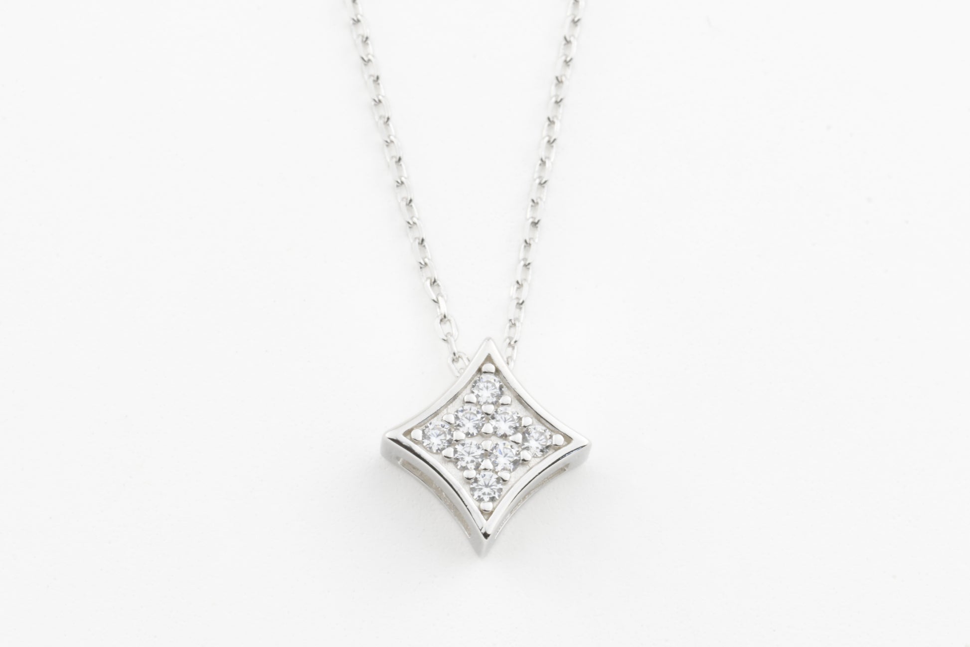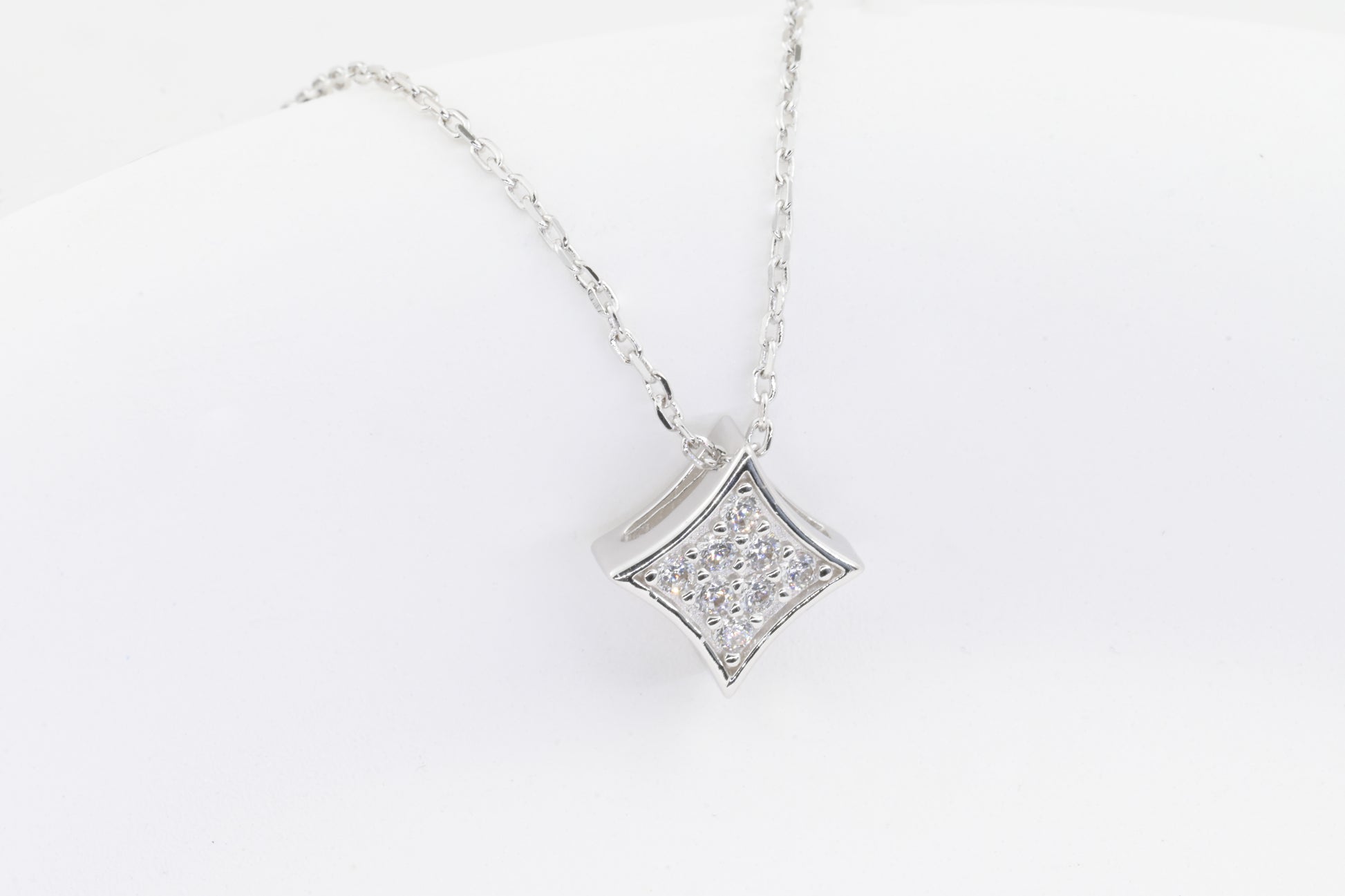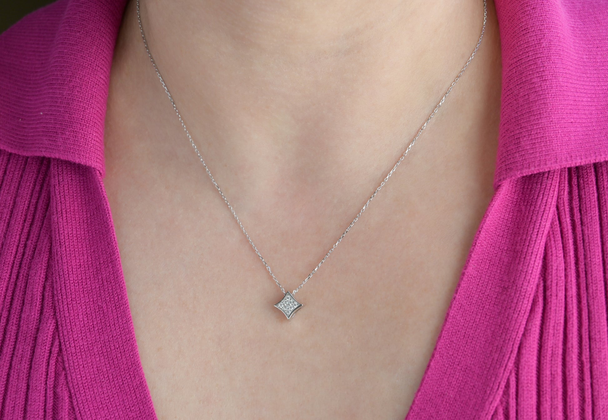 Our Pave Diamond Rhombus Pendant Necklace is meticulously crafted in 925 sterling silver, offering timeless elegance. The pendant gracefully moves along a delicate 16-inch cable chain, measuring 1mm in width. Secured with a small lobster-claw clasp, this necklace adds a touch of sophistication to any outfit.
