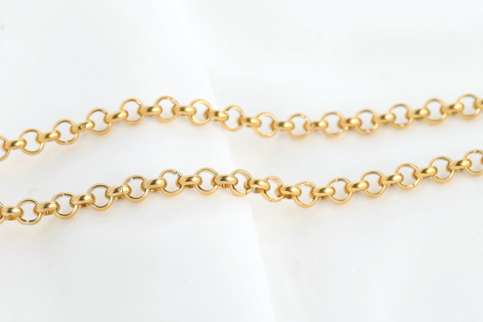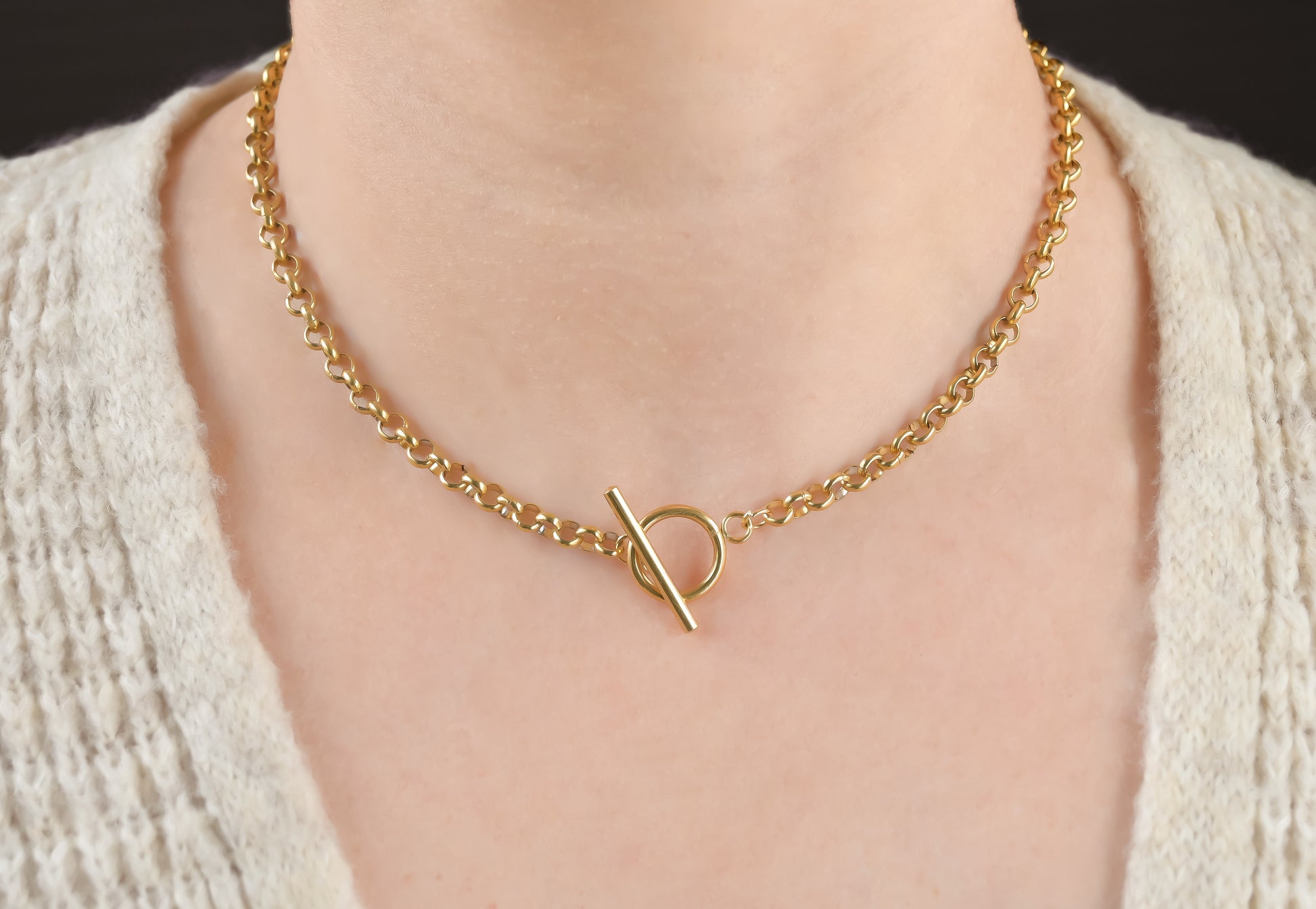 Elevate your style with our Chunky Rolo Chain Choker. Crafted from durable stainless steel and adorned with an 18k gold PVD plated finish, this statement piece features a thick 5 mm width rolo chain measuring 17 inches in length, including the clasp, ensuring a snug choker fit. The versatile toggle clasp can be worn in the front or at the back, allowing you to create different looks. Personalize it with an 8 mm round letter charm, elegantly placed next to the bar for added flair. Embrace bold elegance with this exquisite choker.