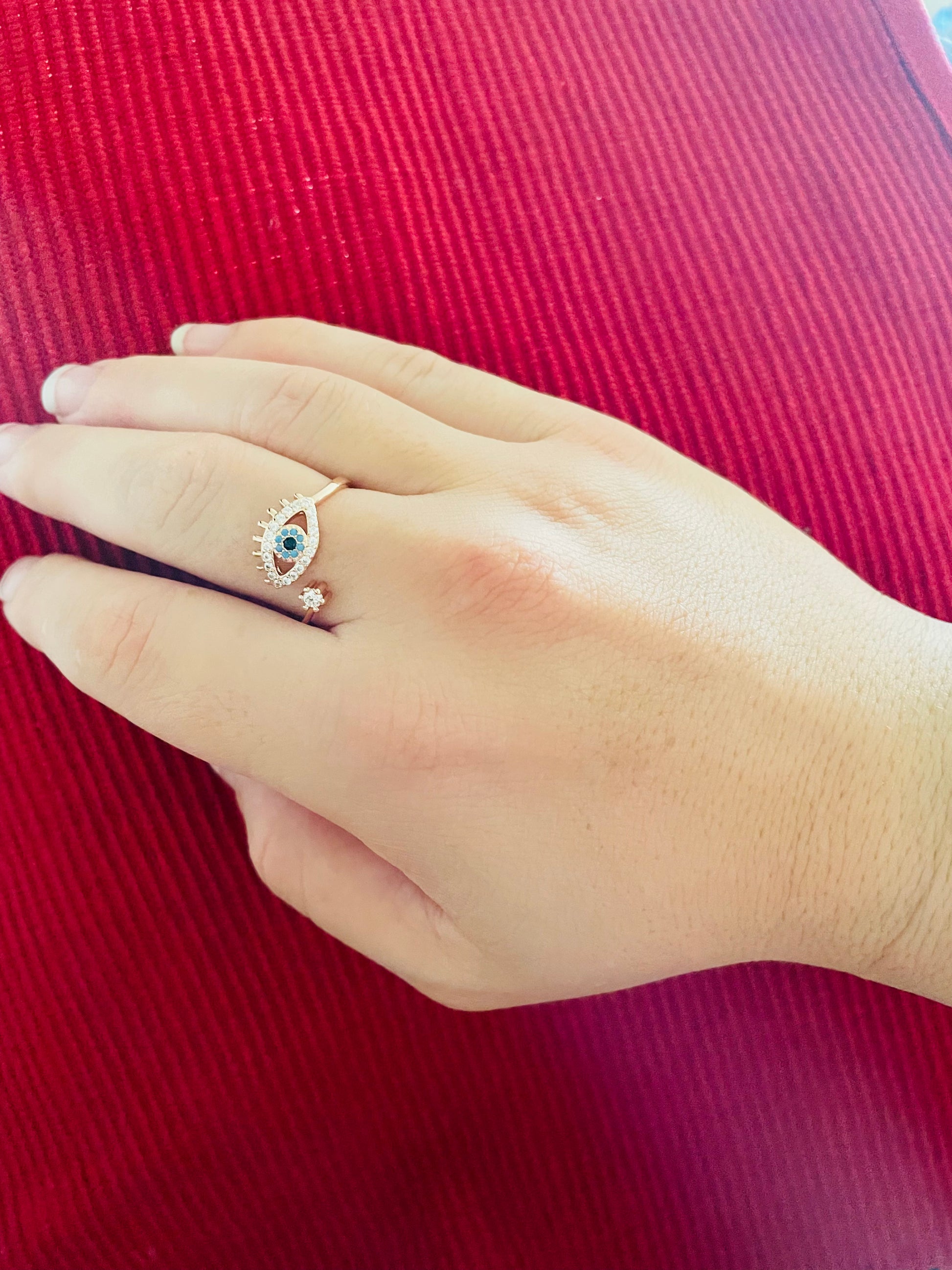 Adorned with black 'pupil' stone in the center framed by turquoise gemstones and sparkling clear crystals, this stunning evil eye ring, an ancient protective talisman, will elevate your look and protect you against negative energy. Available in silver, gold and rose gold.