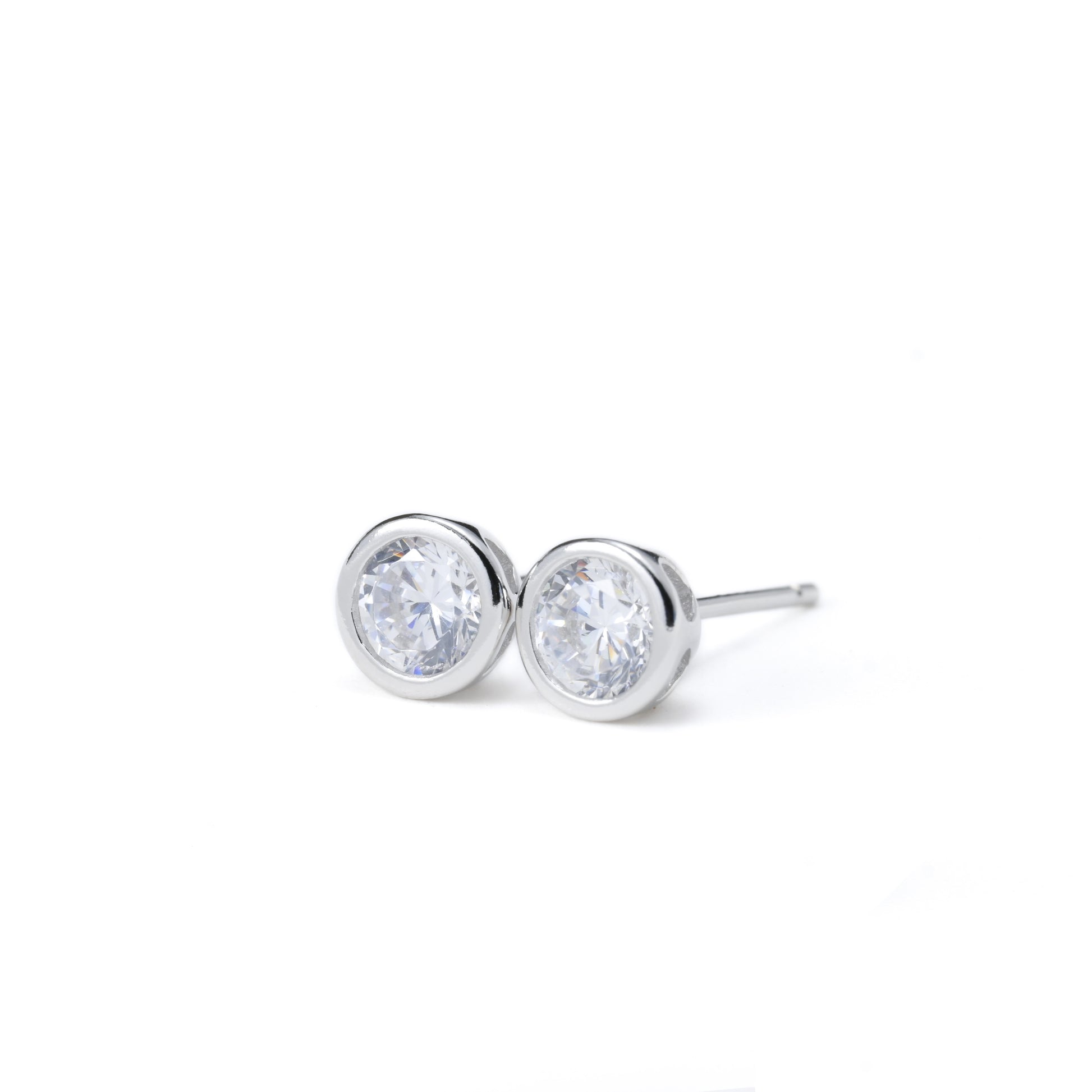 Embrace classic style with our sterling silver round diamond studs in bezel setting. These small round studs measure 6mm. CZ stones add sparkle. Simple elegance for any occasion.