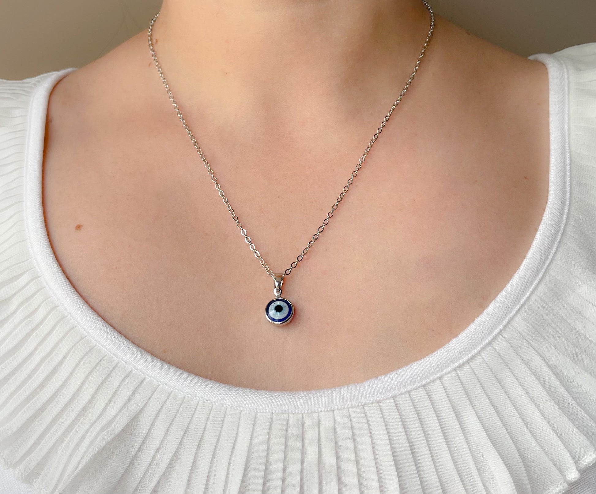 A symbol of divine protection since ancient times, this stunning evil eye pendant necklace feature a round evil eye charm with silver glitters on the 'white of the eye', which add an extra sparkle to the necklace. The pendant is attached to a 19-inch cable chain, which can be adjusted upon request.