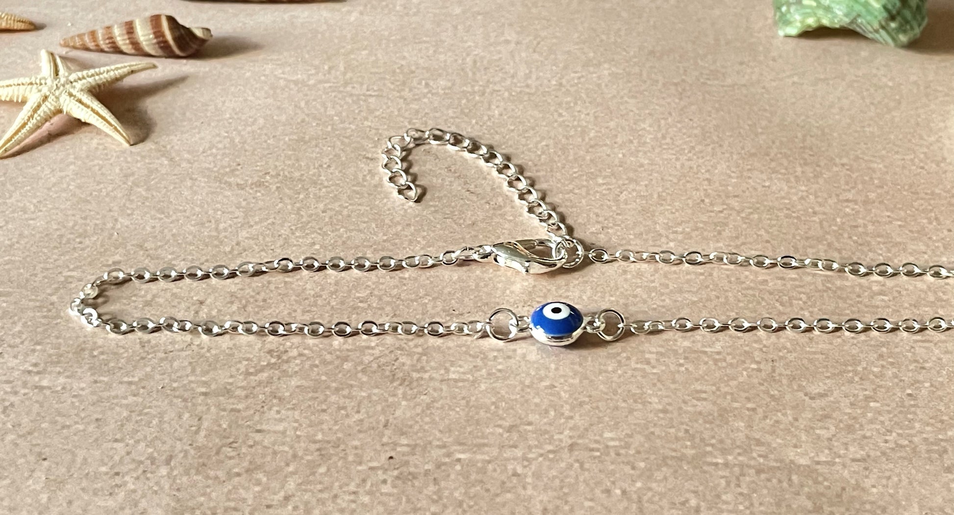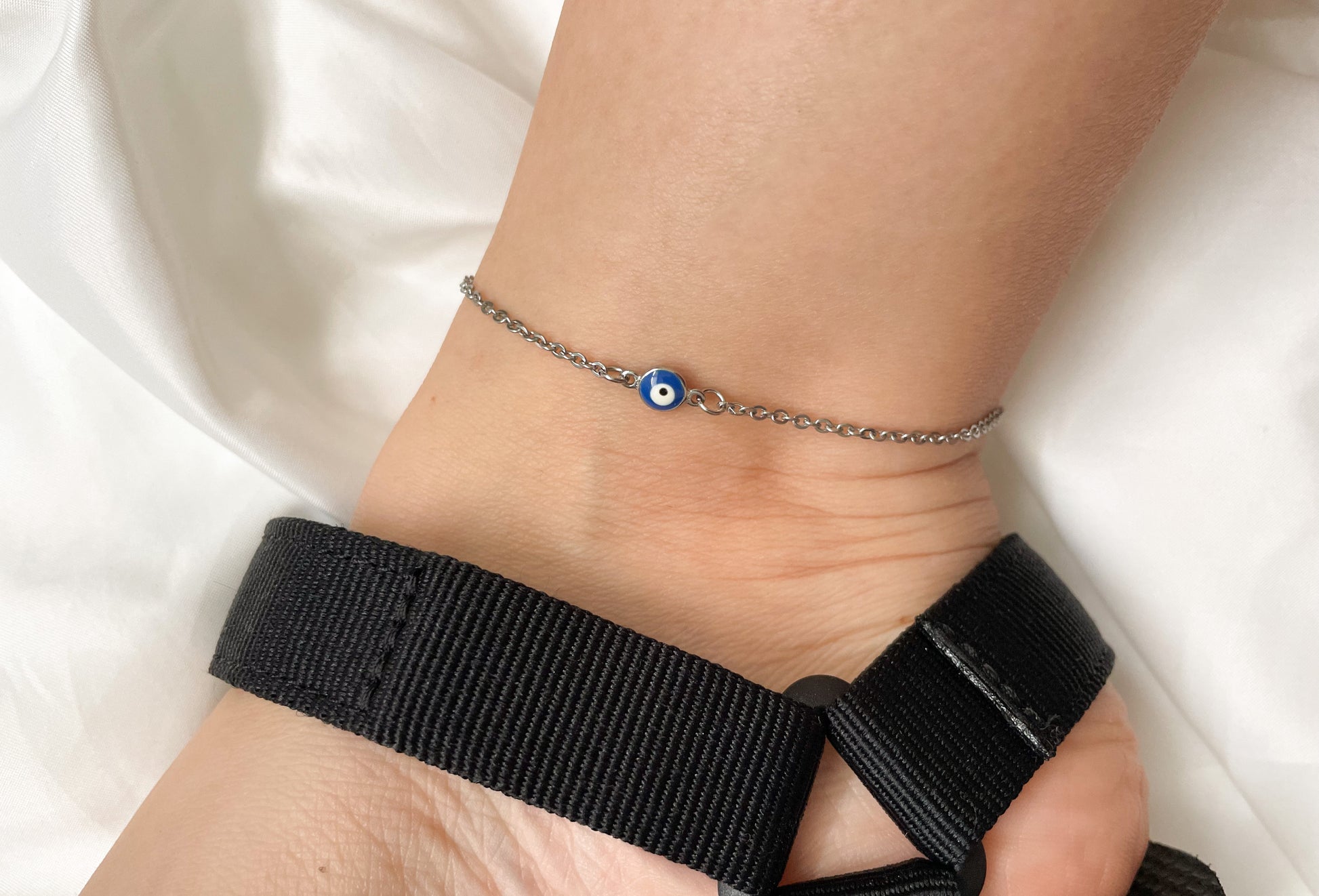 This dainty chain anklet has a tiny evil eye charm, which is meant to bring good luck to those who wear it and protect against the evil eye. Made of high quality stainless steel, it is waterproof and made to last. Available in gold and silver.