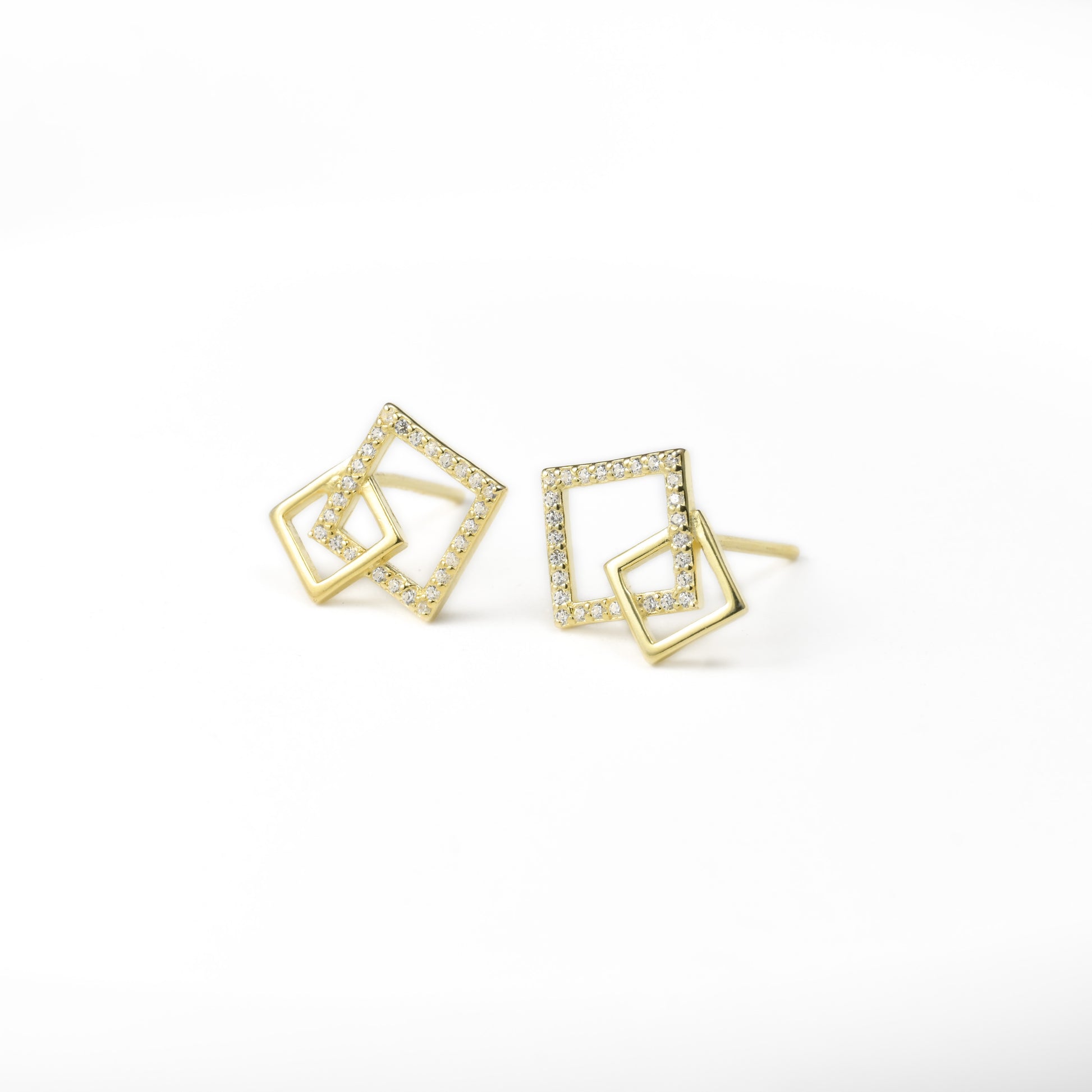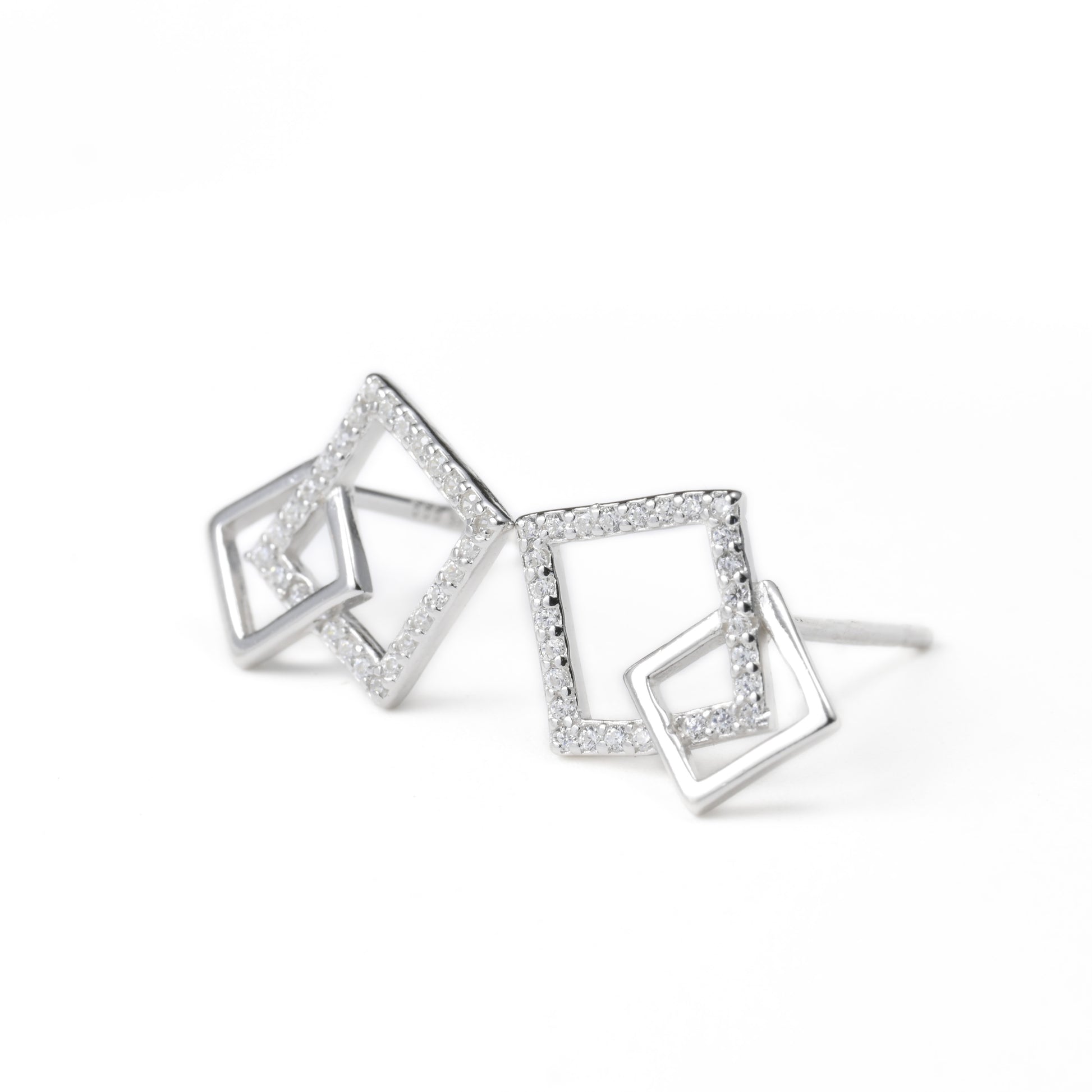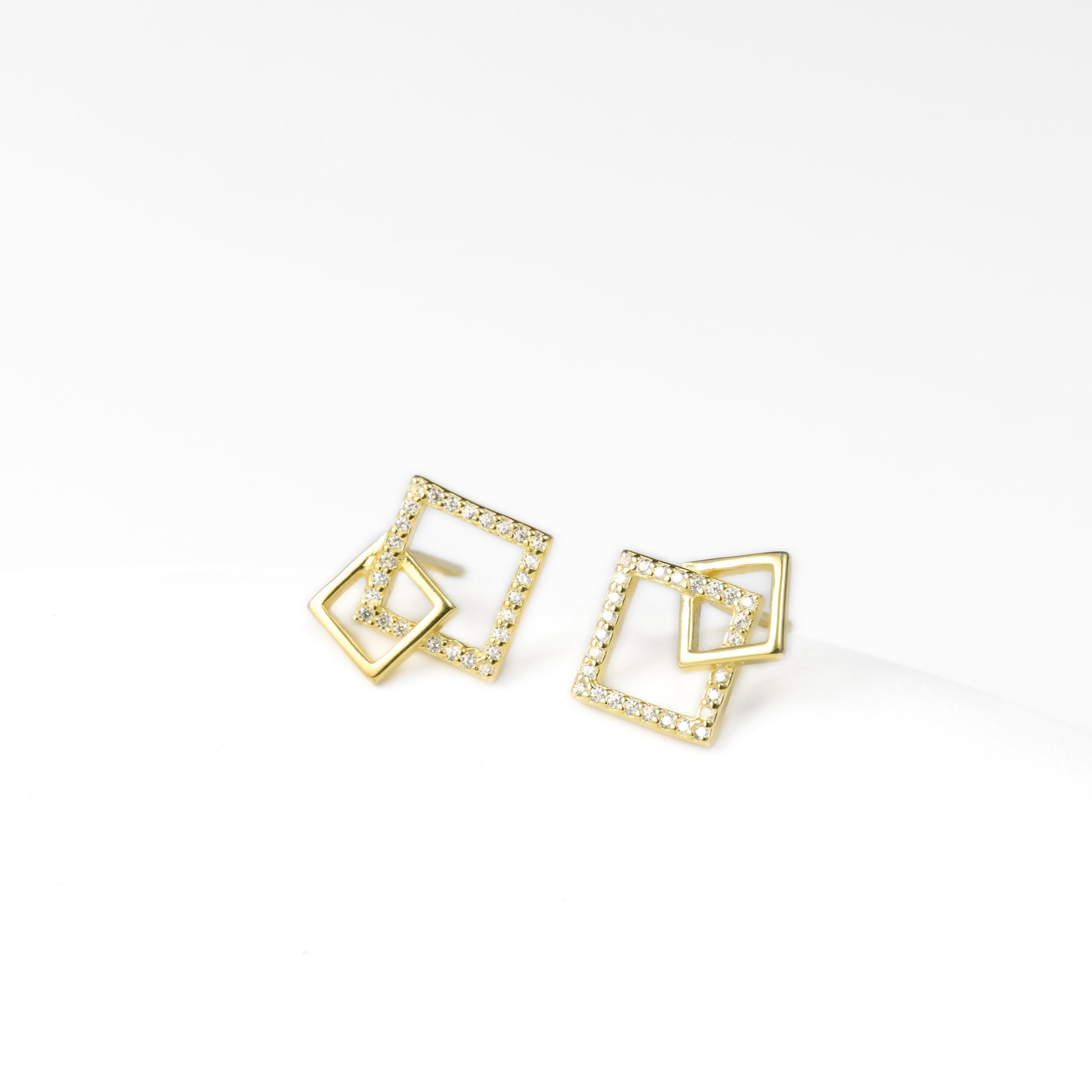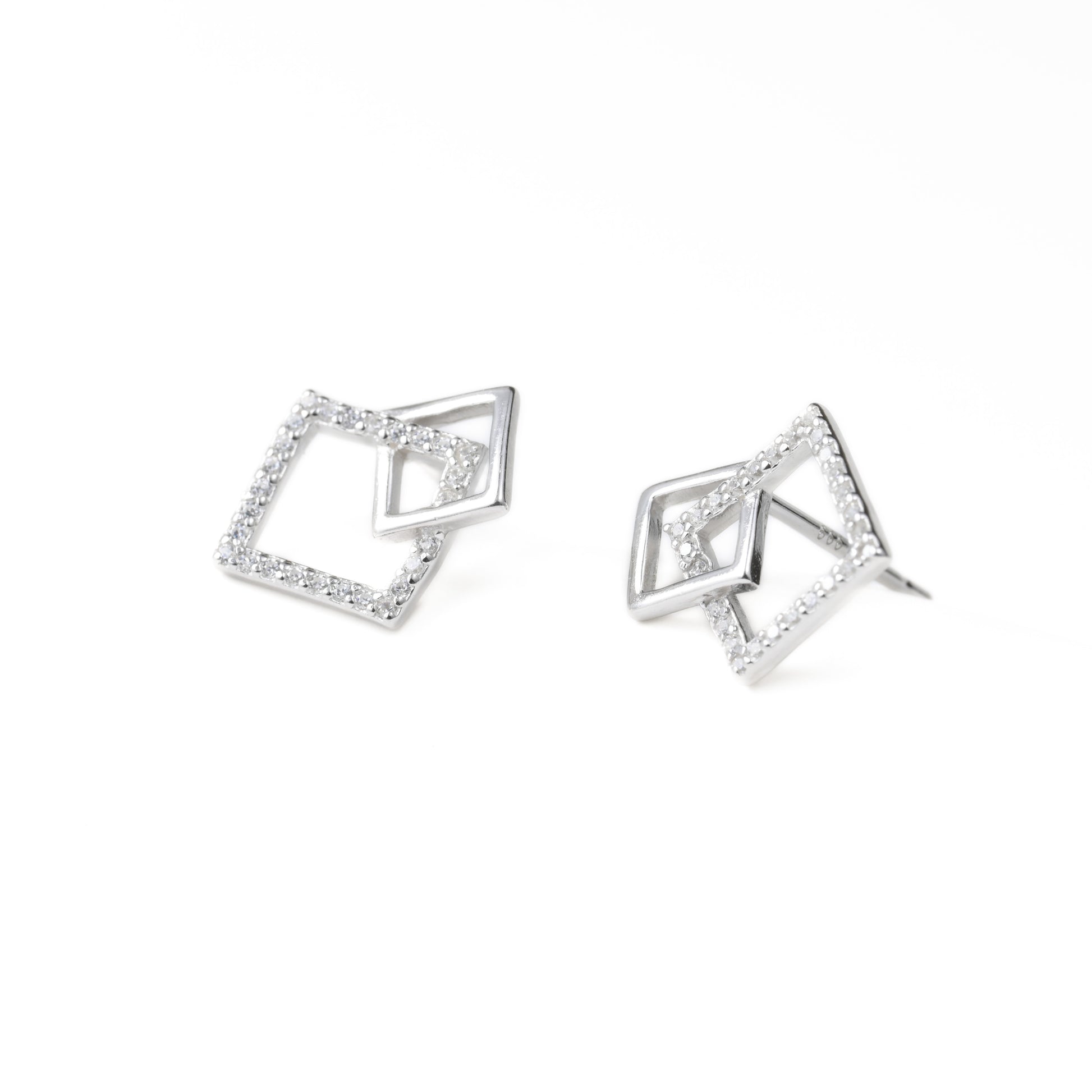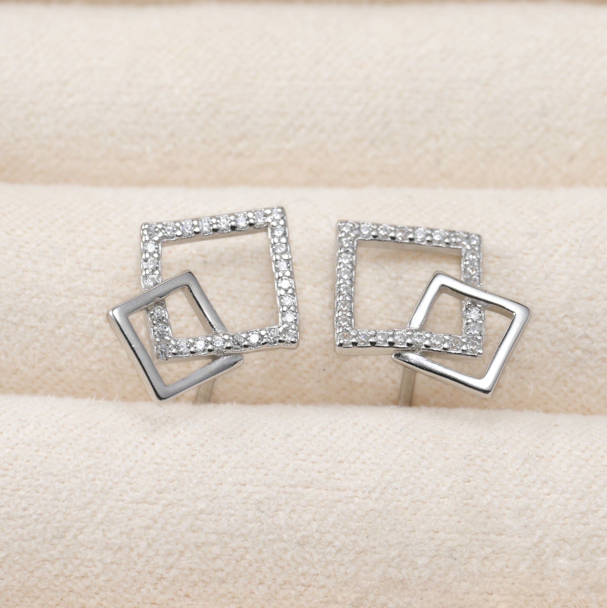Elegant linked pave diamond square stud earrings in sterling silver. Small (6mm) and bigger (8mm) squares linked, adorned with cubic zirconia stones. Available in 18k gold and silver finish.