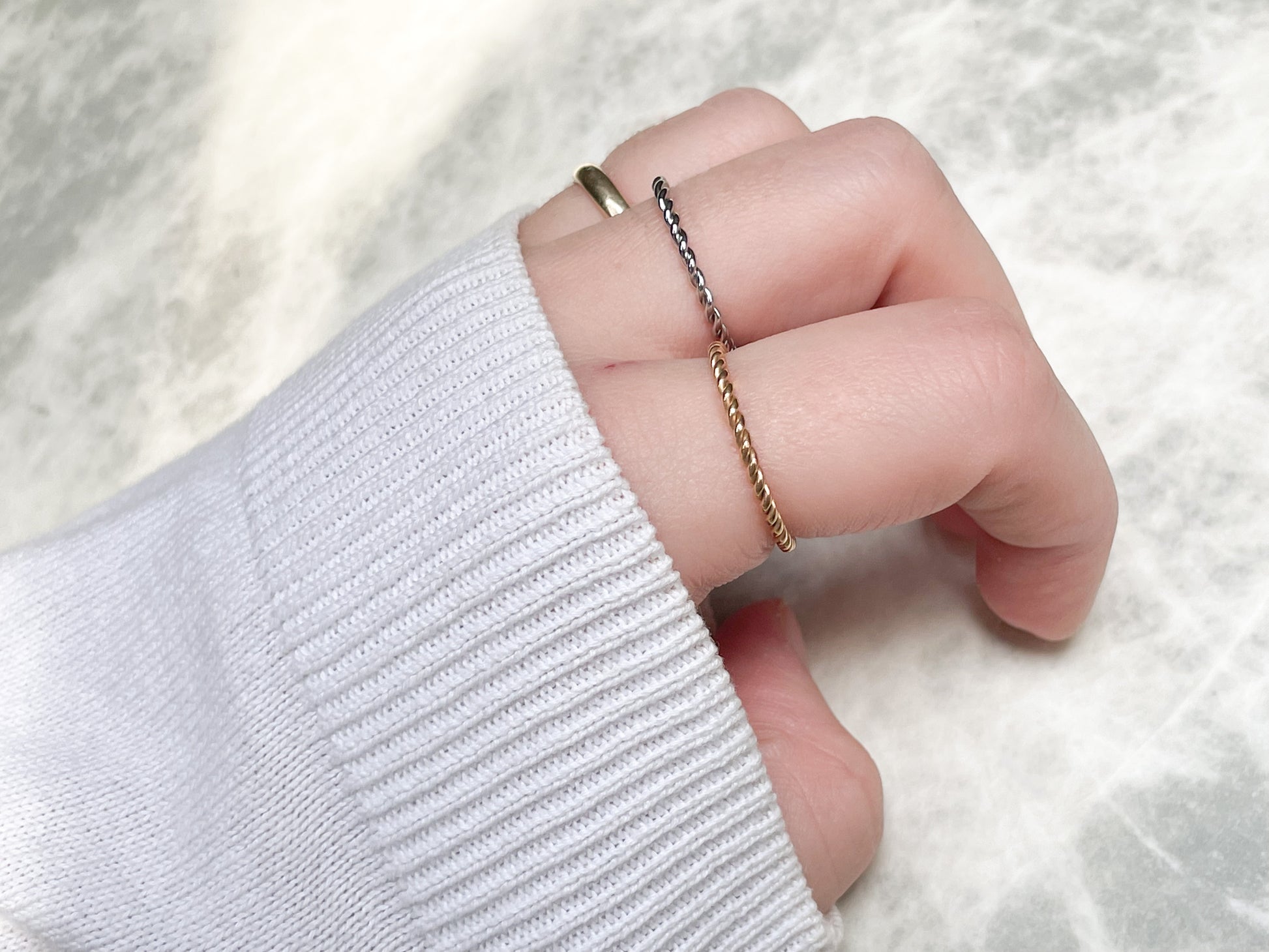 A stacker twisted ring for everyday wear. Handcrafted in 18k gold plated stainless steel, non-tarnish and waterproof, this design features a slim rope band in gold and silver and matches well with other stacking rings. Available in sizes 6, 7 and 8 and 9.