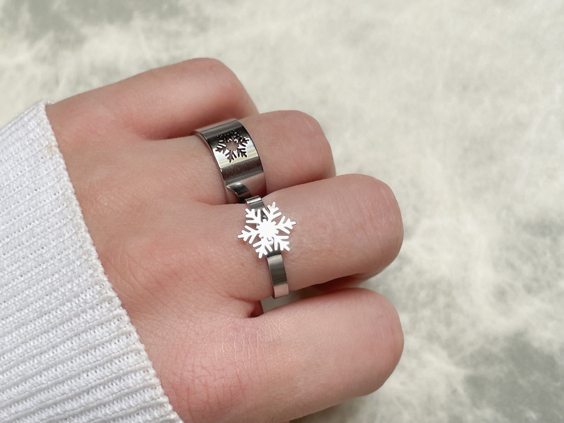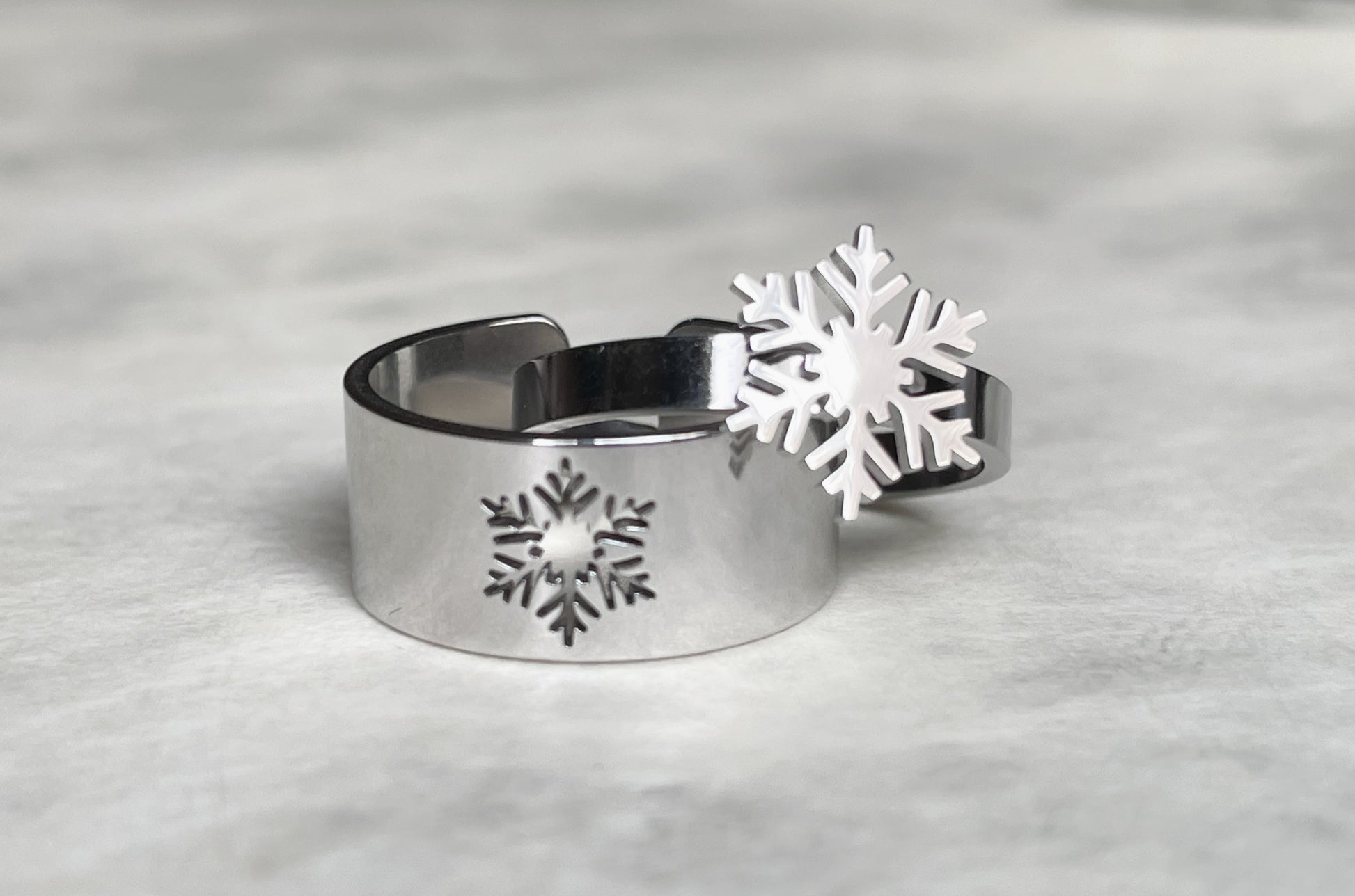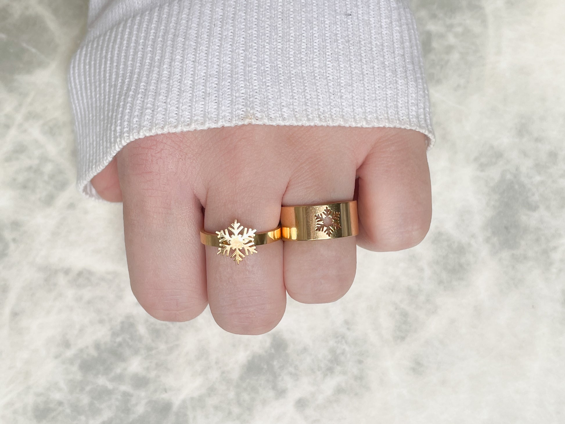 A beautiful snowflake ring set for the holiday season. Handcrafted in stainless steel (non-tarnish and waterproof) with 24k Gold PVD Plated Finish, this open-design ring set features a slim band with a snowflake that catches light perfectly and a thicker band with a smaller-sized snowflake. Both rings are adjustable to fit just right. Makes the perfect gift for the upcoming holidays! Comes in 18k gold plated and silver polished finish.