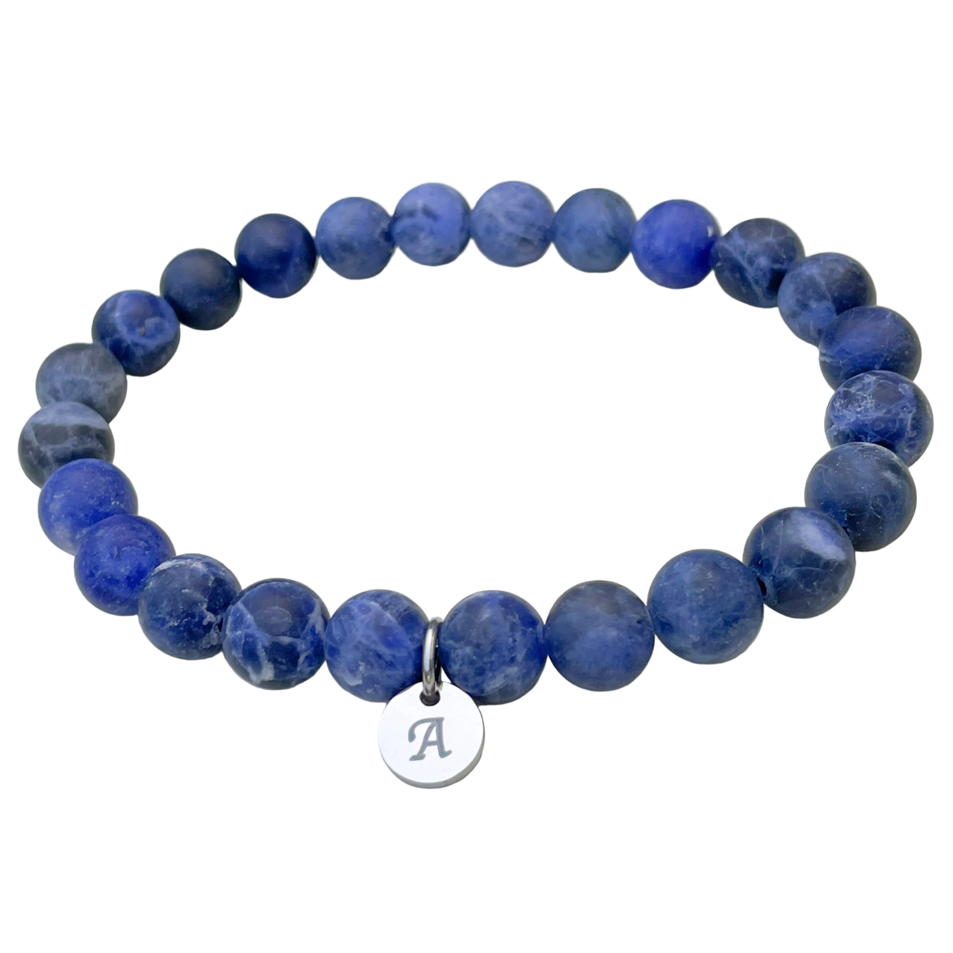 This wonderful bracelet is made from unique 6 mm, 8 mm and 10 mm semi precious sodalite stones with a silver letter charm in the center, if you choose to have one! A fantastic piece of jewelry to match with any outfit.