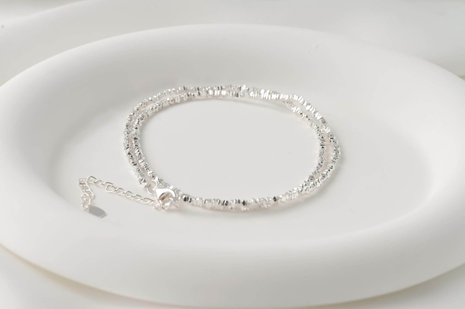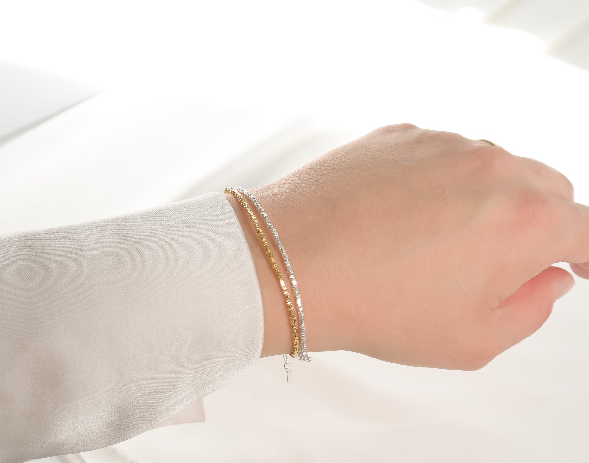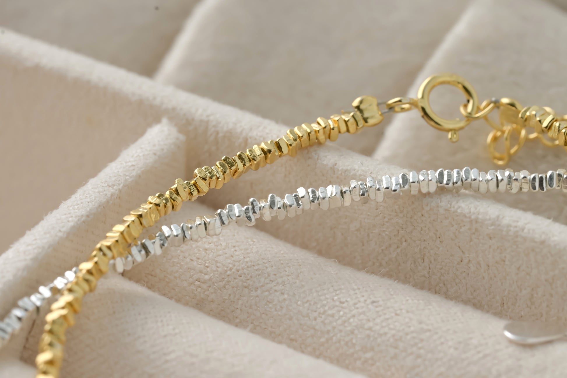 Elevate your style with our sterling silver beaded bracelets, featuring a 6" cable chain with a 1-inch extender and exquisite solid silver beads available in gold and silver finish. Add a letter charm at the clasp area for a personalized touch. Discover versatile elegance, and don't forget to explore the matching necklace in silver finish: