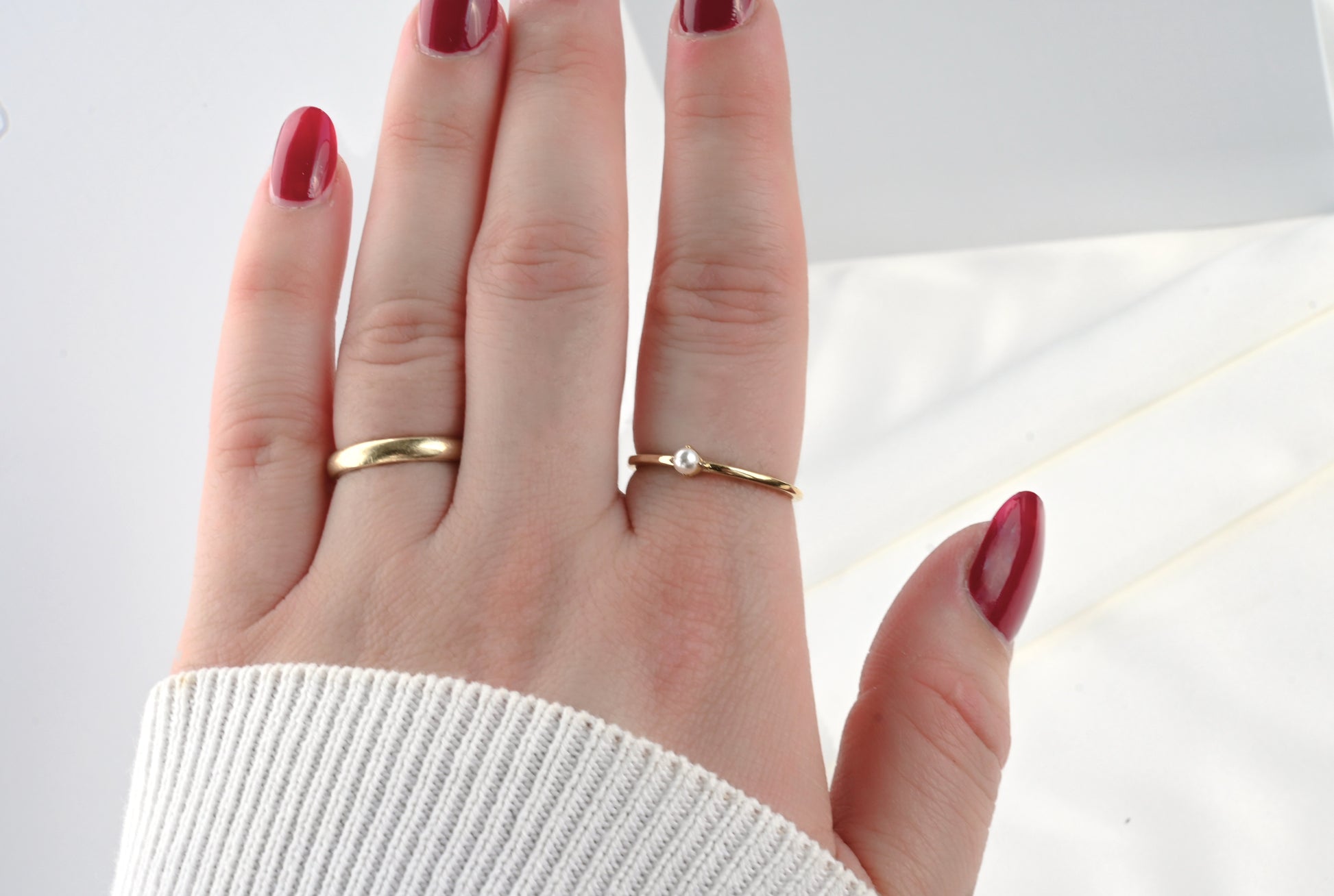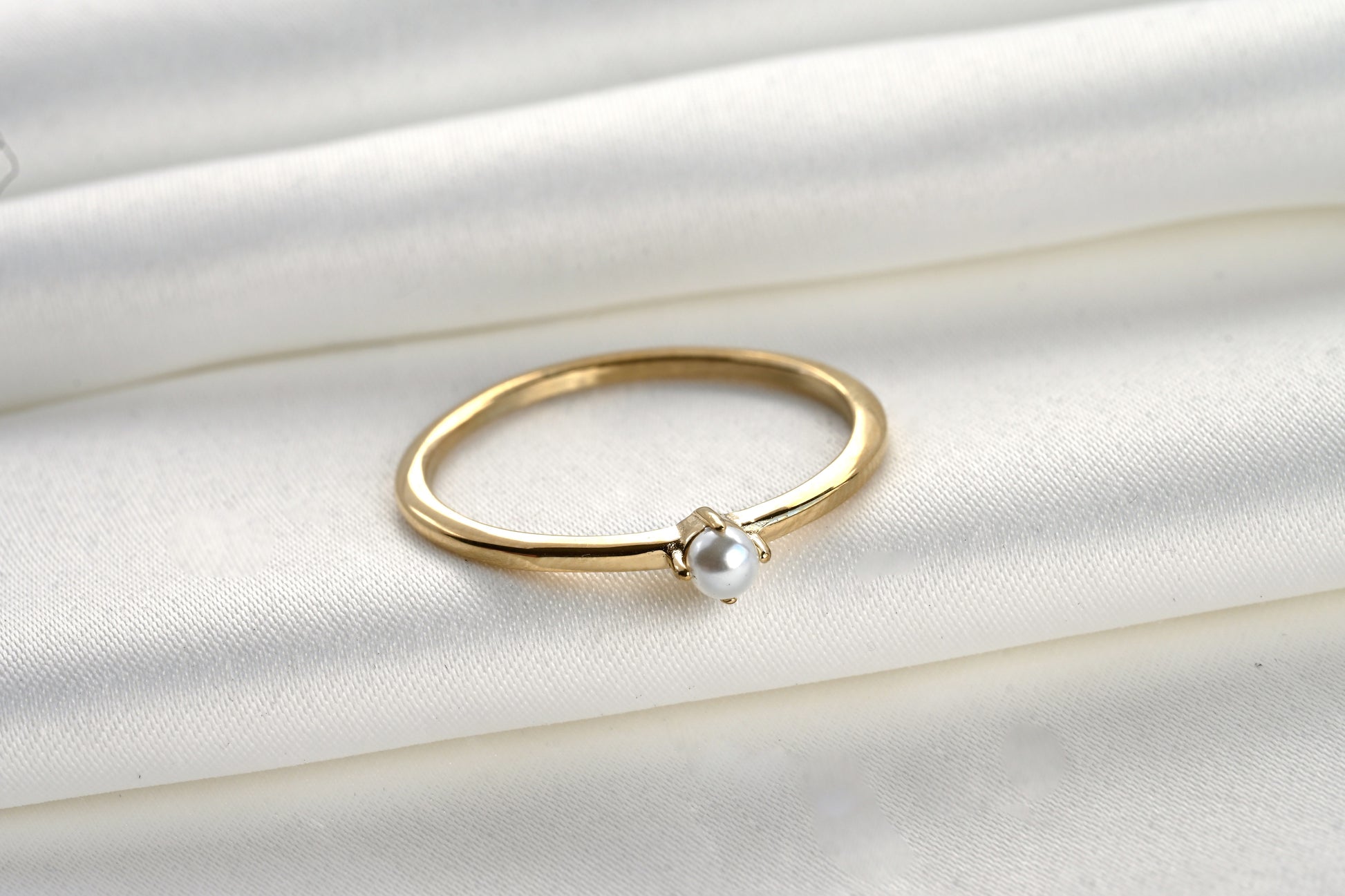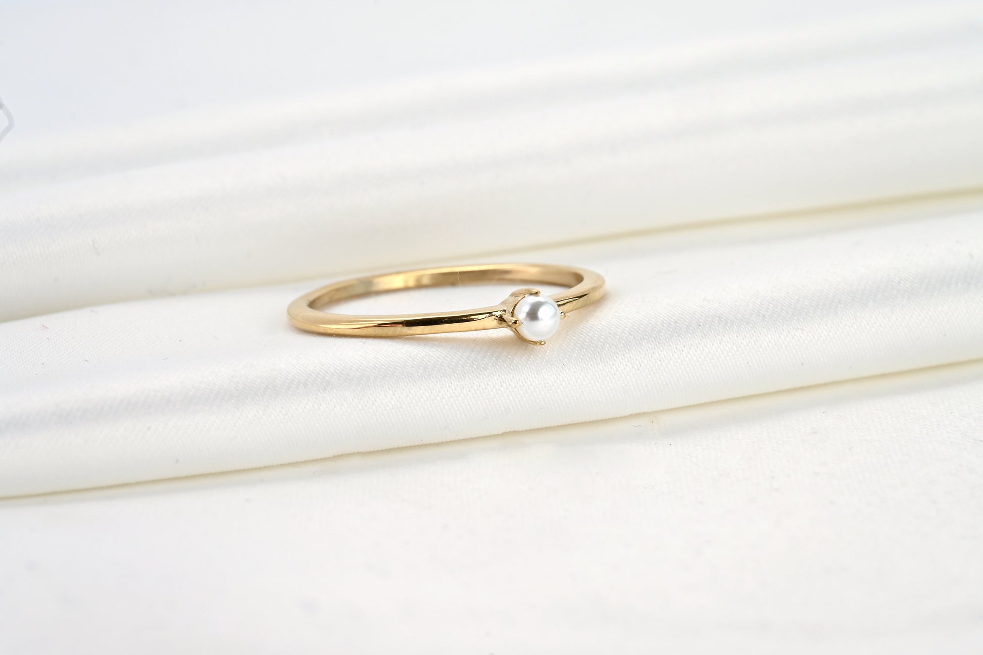 Made in 18k Gold PVD plated stainless steel and set with a single imitation pearl in a prong setting, this sleek waterproof pearl ring is a piece you will hold on to forever. Pair it with chunky bands to create a stack.