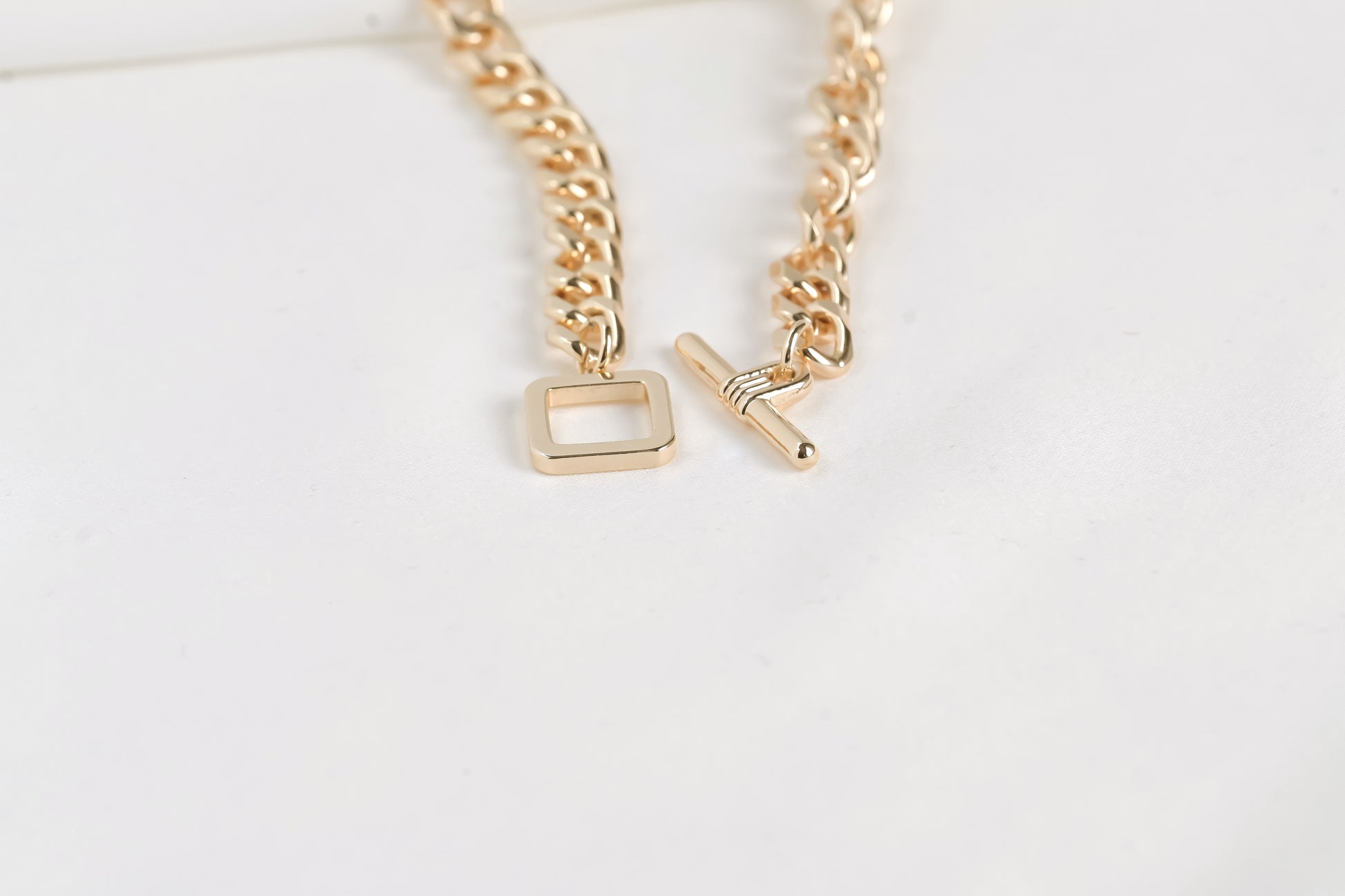 Elevate your style with our Pinkish Gold Curb Chain Choker. Measuring 7 mm in width and 16 inches in length with toggle clasp, it's a unique shade, not rose gold, and fits snug like a choker. A standout accessory for any look!