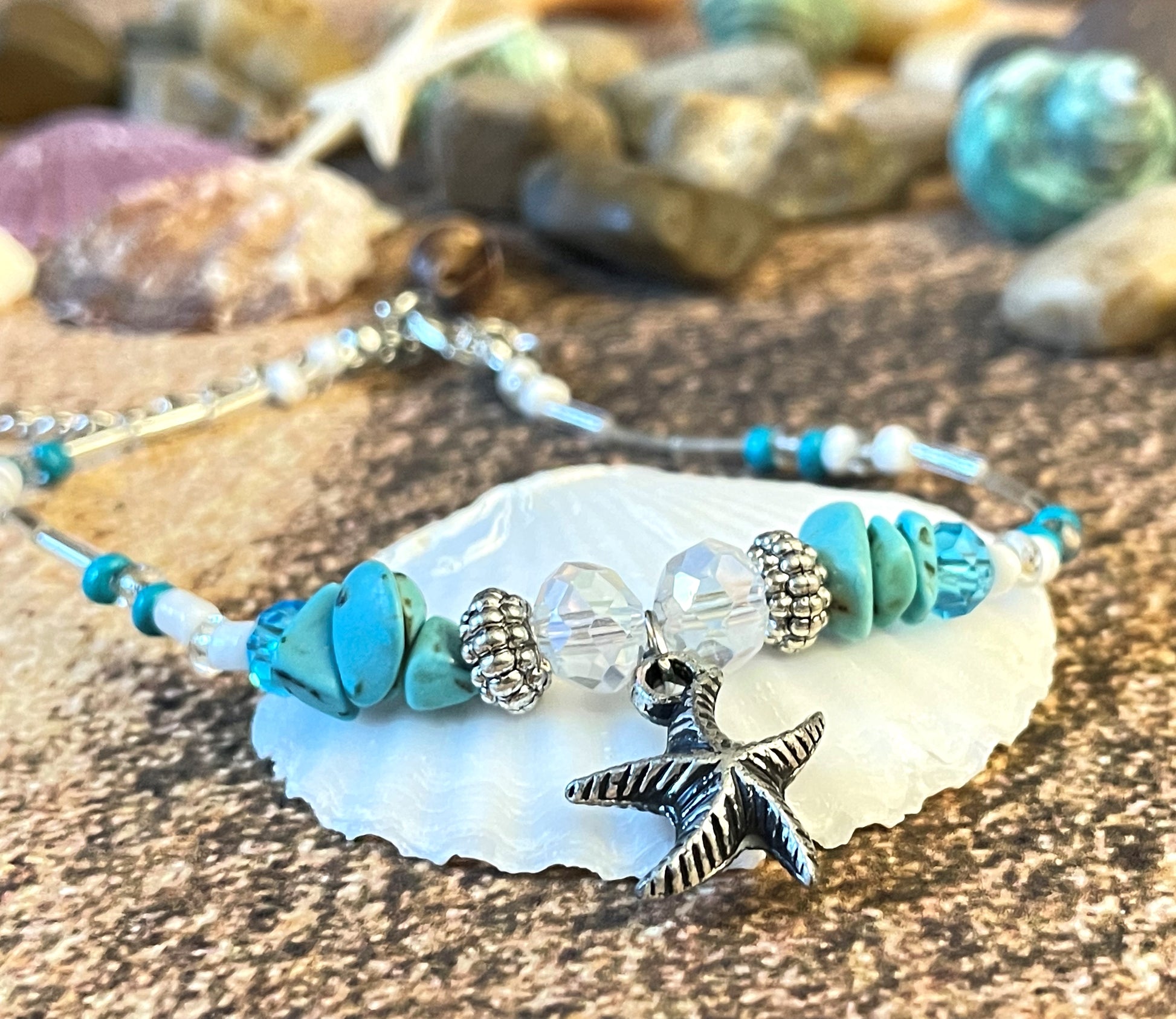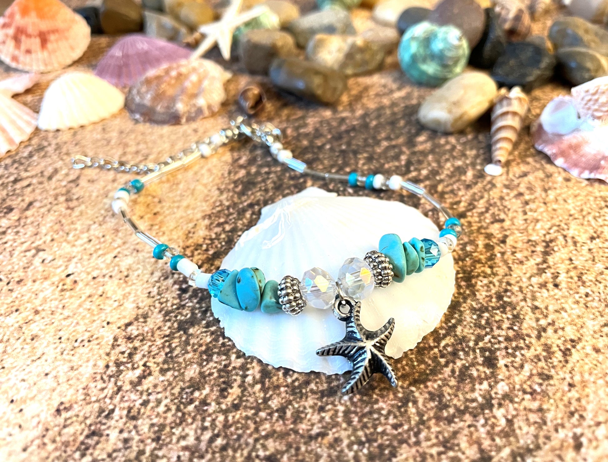 Feel like you are by the seaside with this starfish anklet! Embellished with blue stones, plastic and metal beads, this beaded boho design is a perfect gift for ocean lovers.