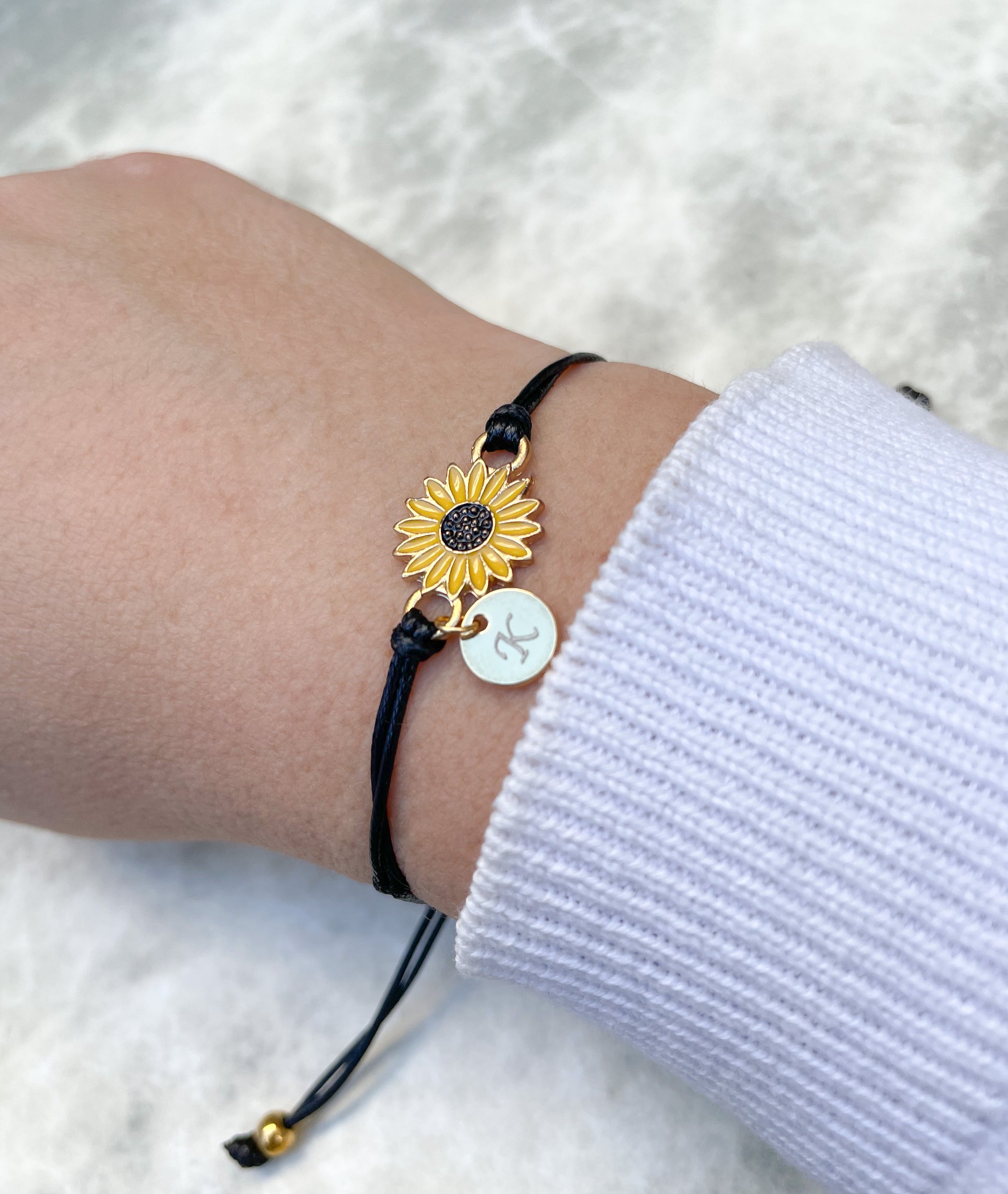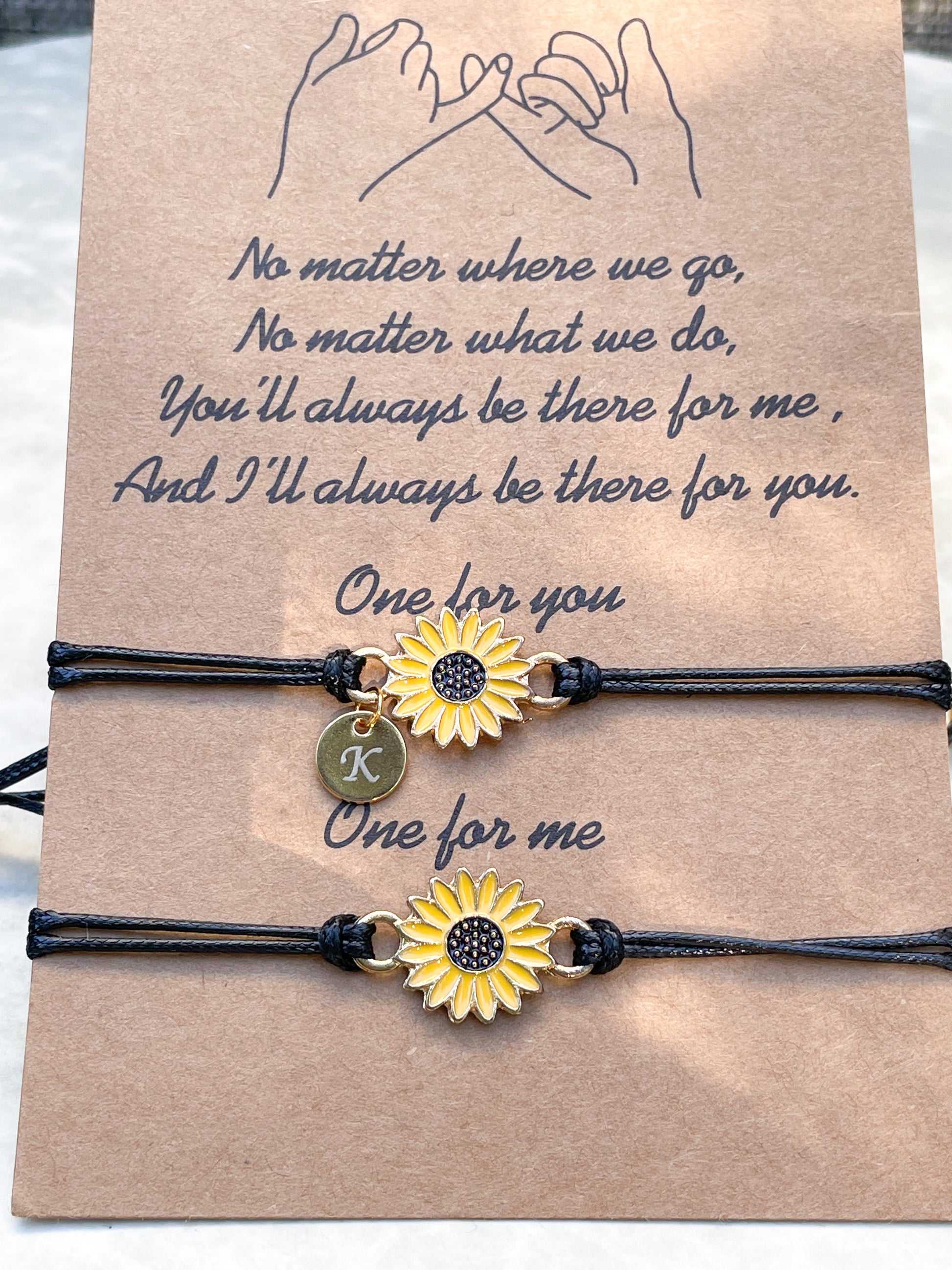Braided wish bracelet set that comes with a free promise card! This friendship bracelet features a sunflower charm centered along a black waxed cord and is easily adjustable for a comfortable fit. It can be personalized with letter charms of your choice in gold and will be the perfect present for your friends and family.