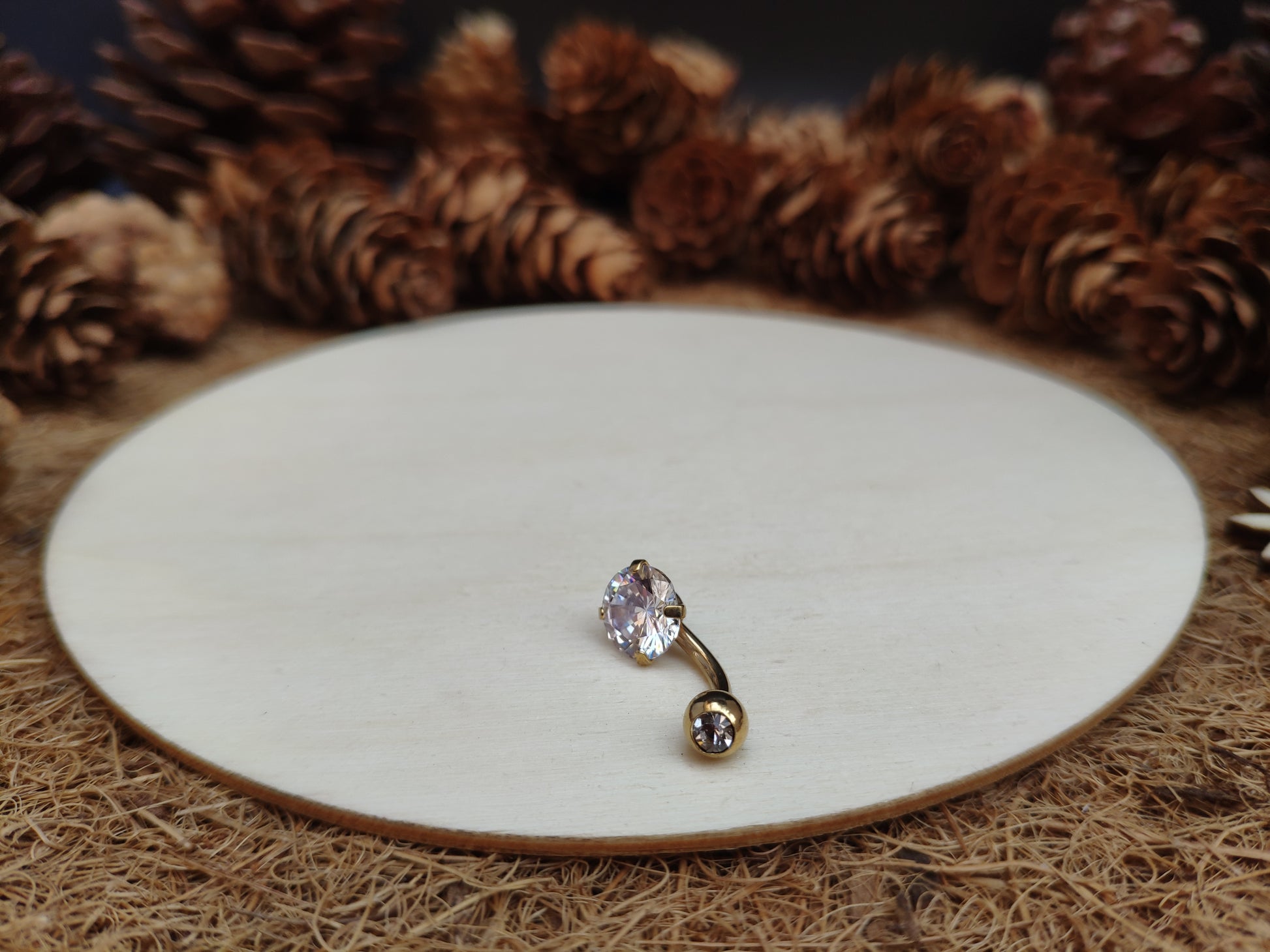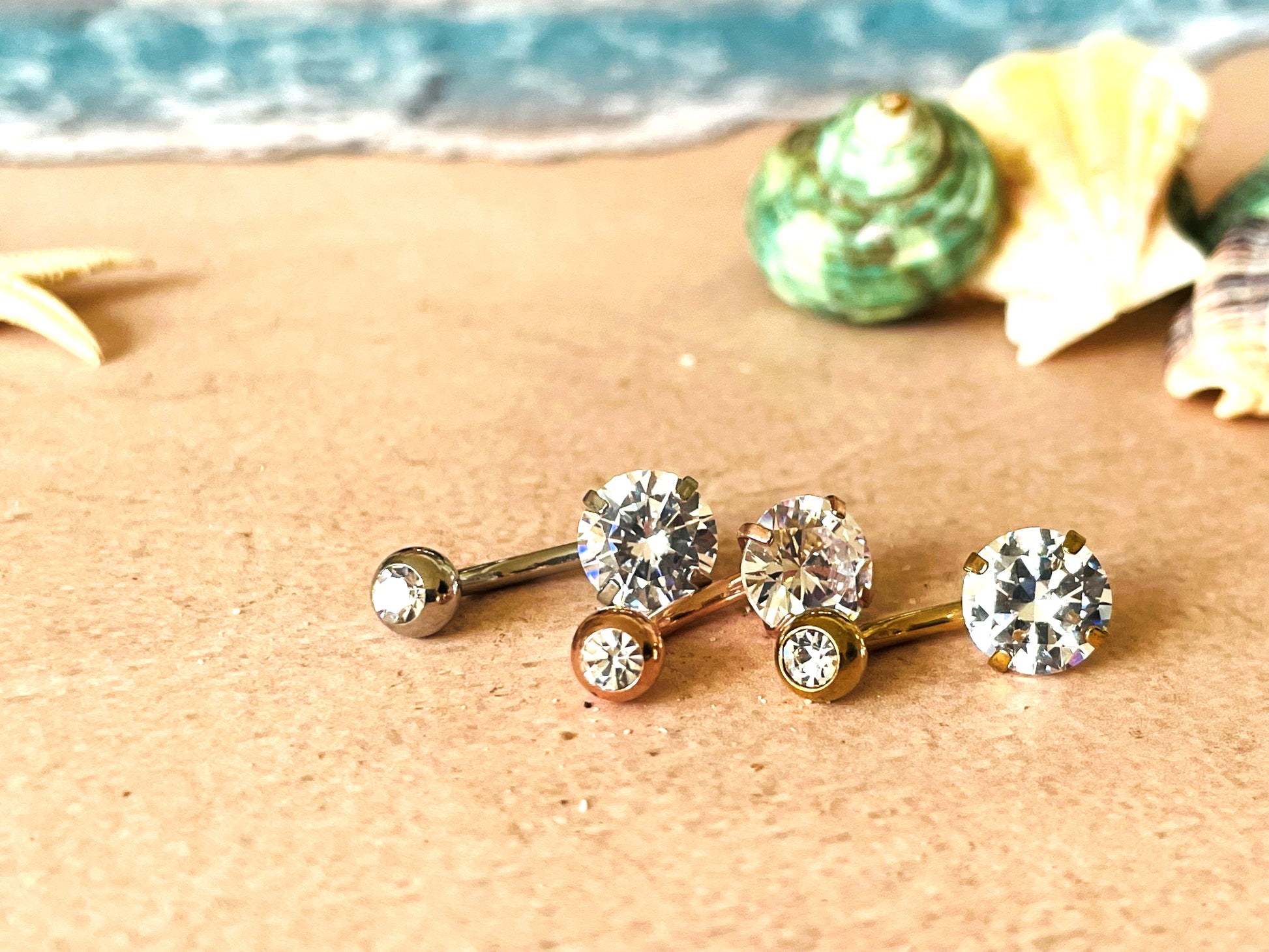 This amazing naval piece features a 8 mm crystal and a smaller (4 mm) crystal in its ball that deliver sparkles. Made of surgical steel, this 14g hypoallergenic belly piercing has a barbell length of 11 mm and is available in gold, silver and black.