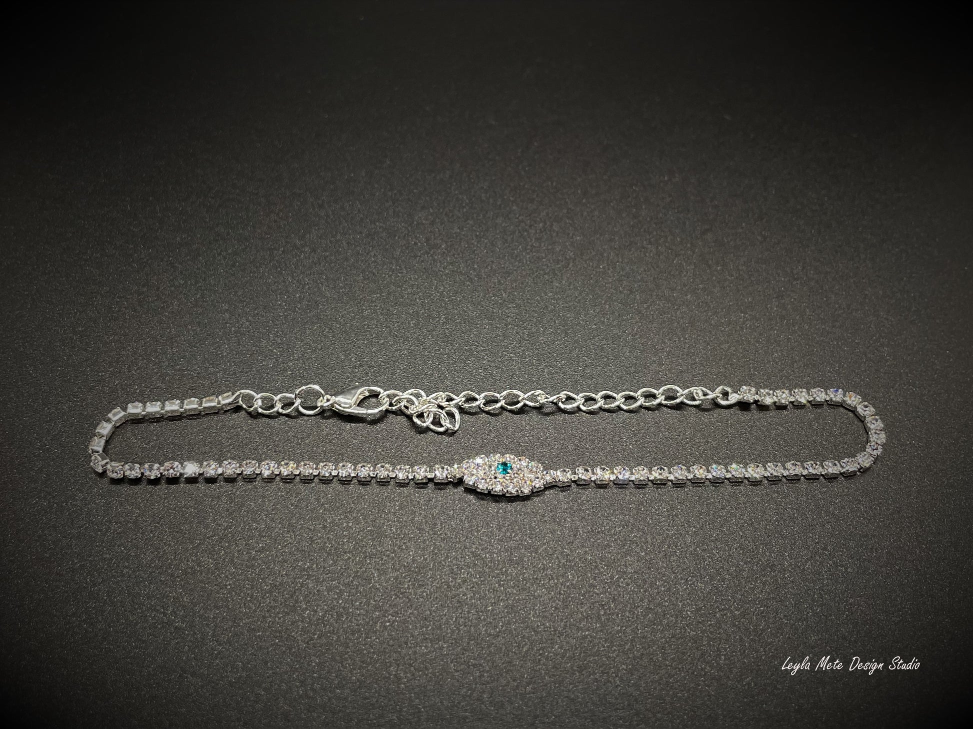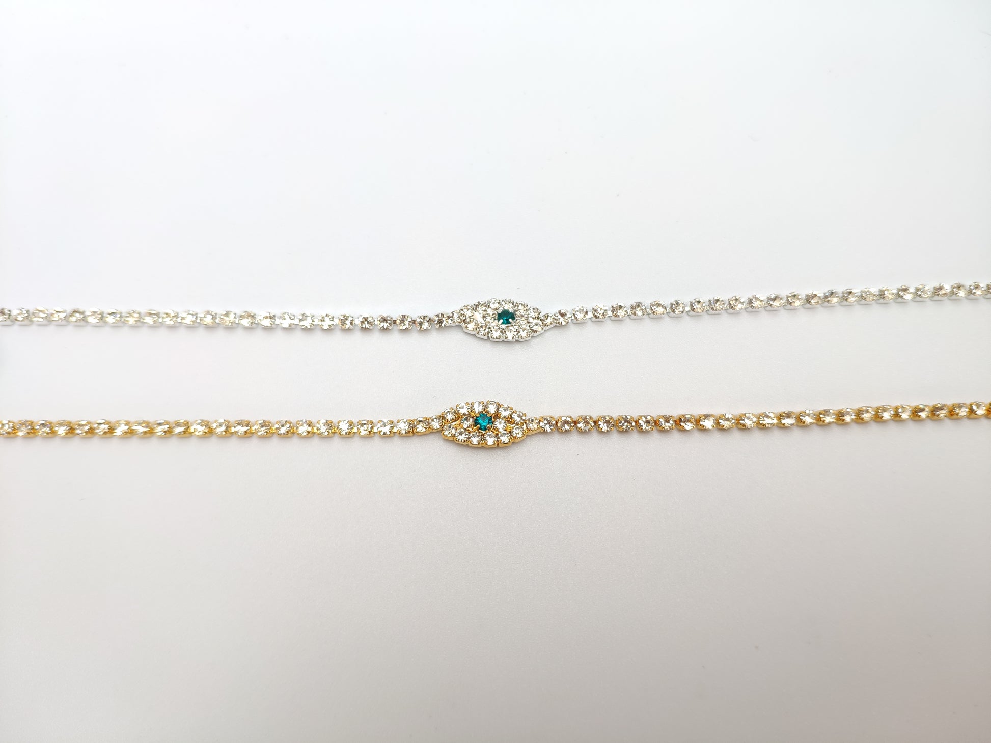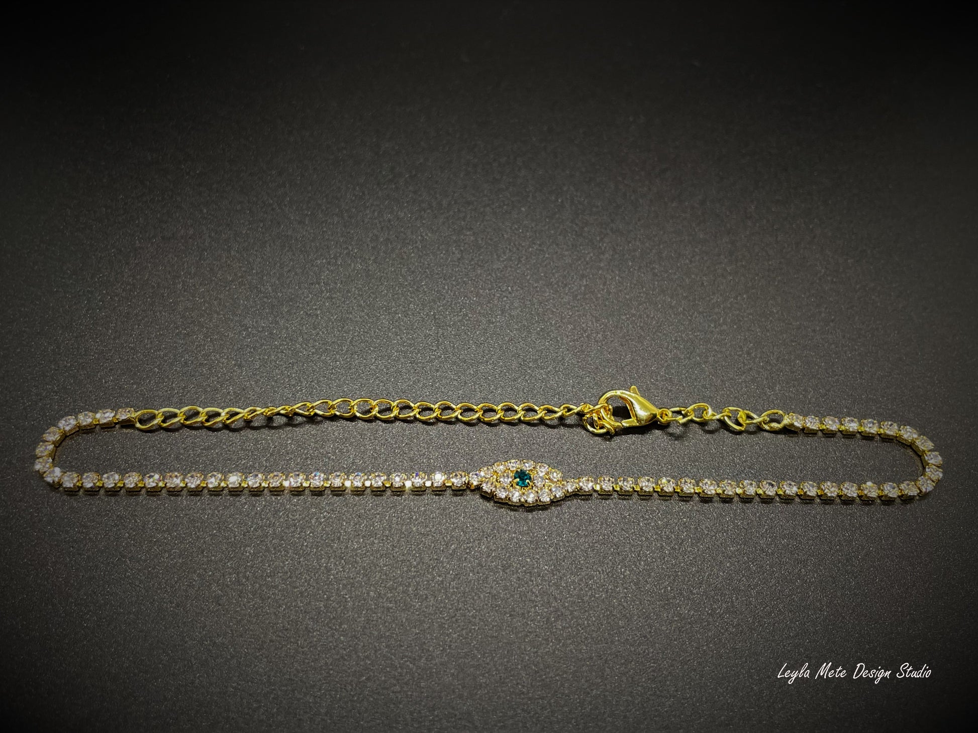 Embrace elegance with this dainty tennis chain ankle bracelet. This vintage design features an evil eye in the center to protect you whenever and wherever! Perfect protection jewelry for any occasion. Available in gold and silver.