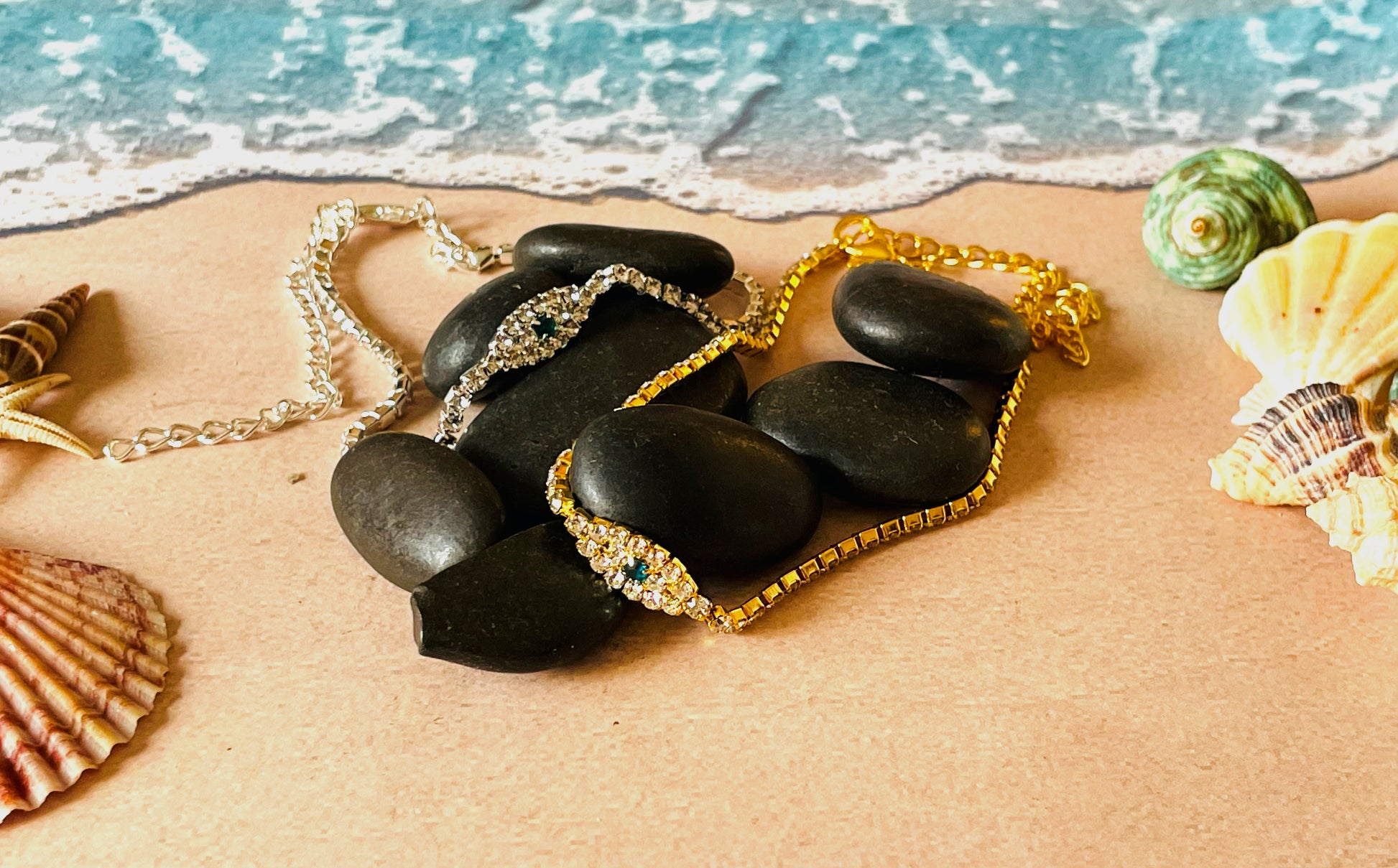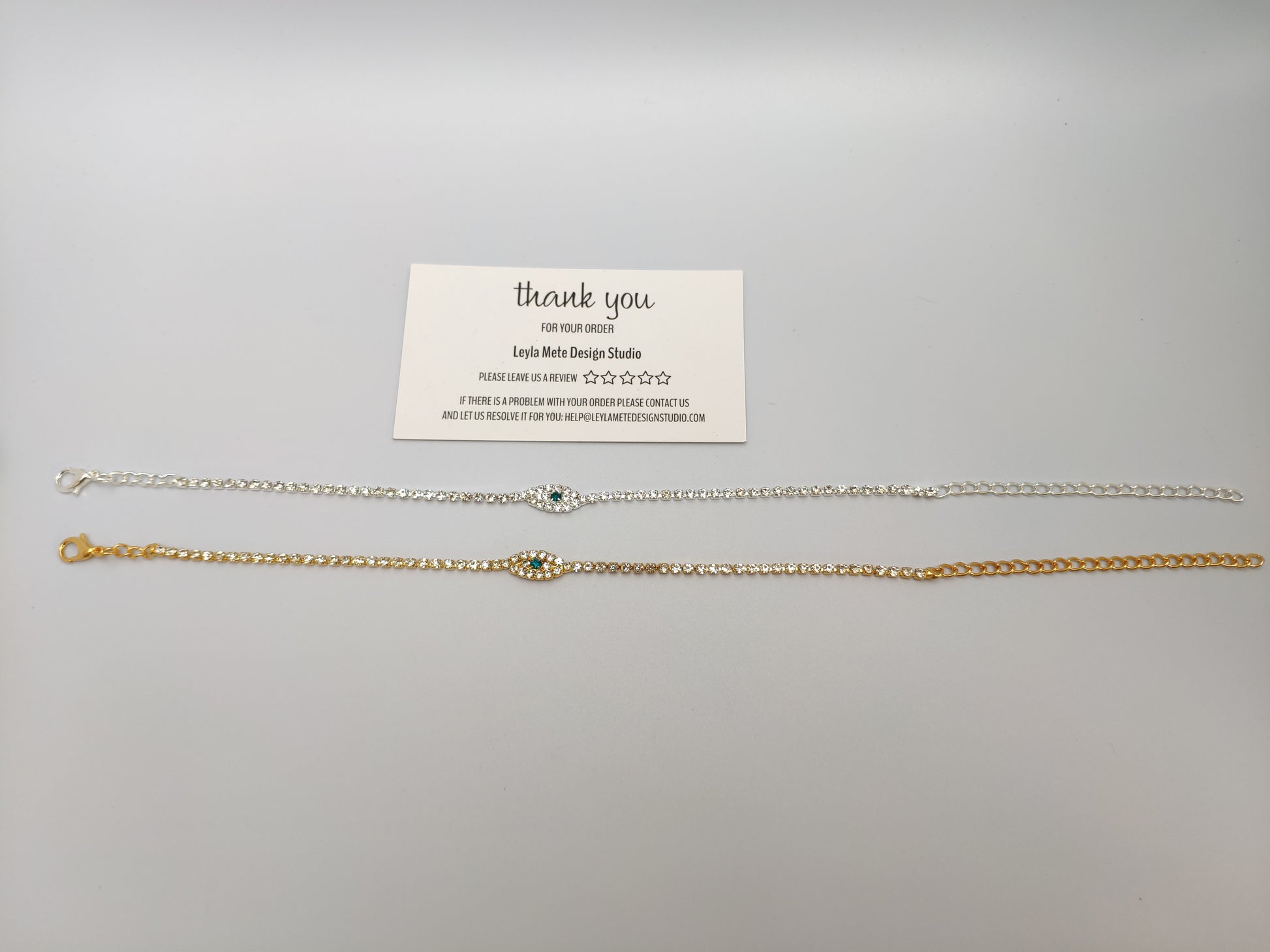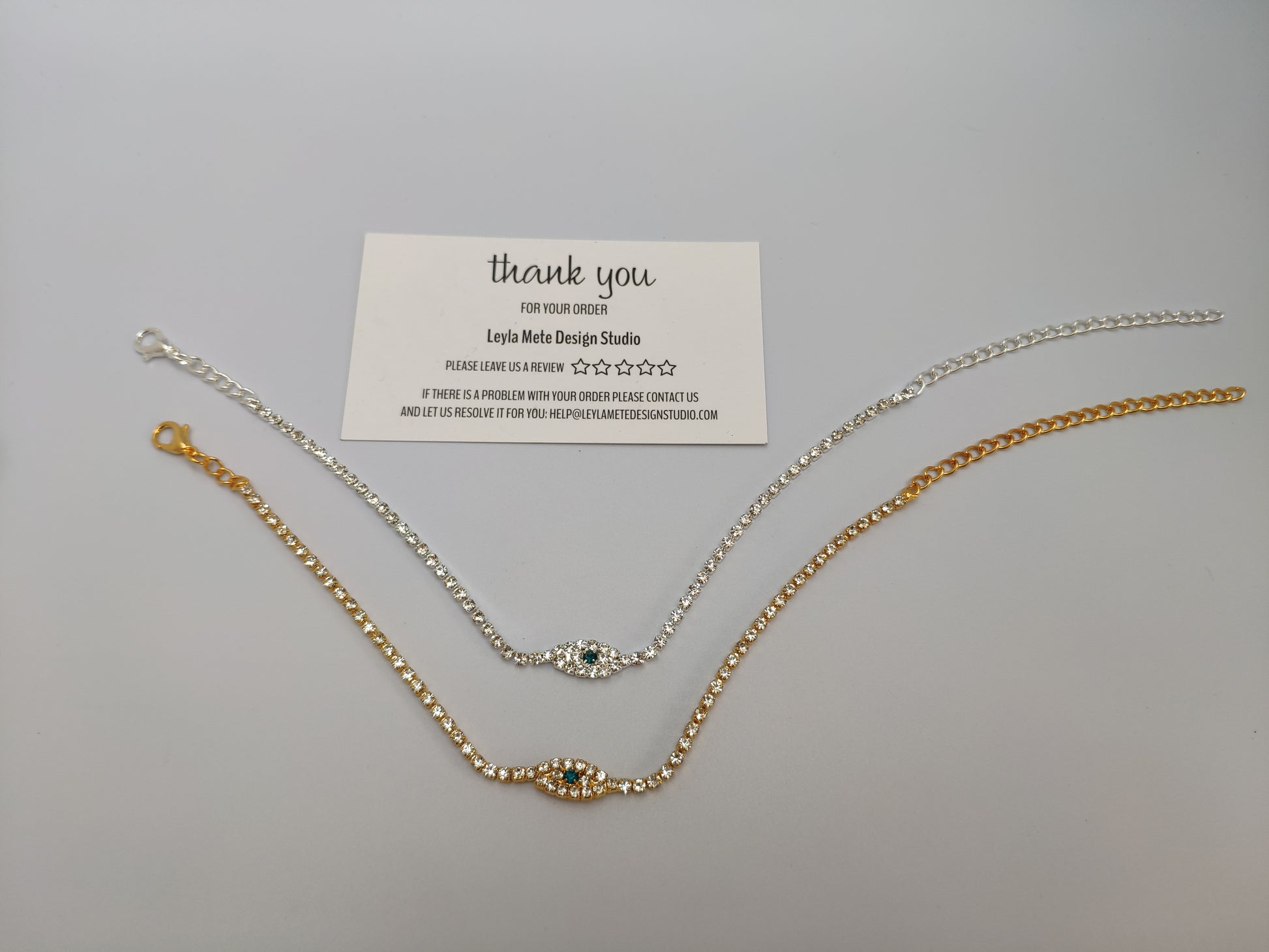 Embrace elegance with this dainty tennis chain ankle bracelet. This vintage design features an evil eye in the center to protect you whenever and wherever! Perfect protection jewelry for any occasion. Available in gold and silver.