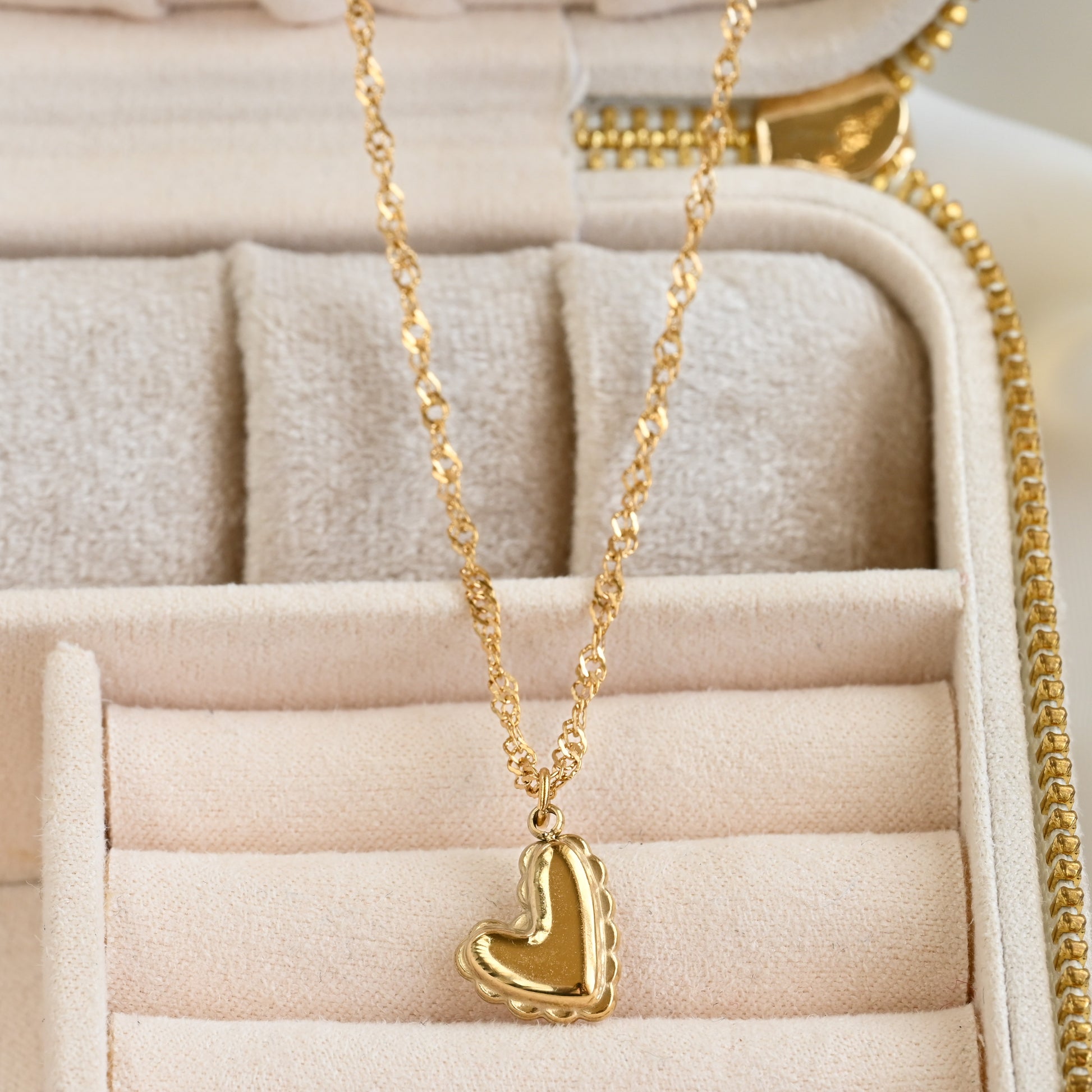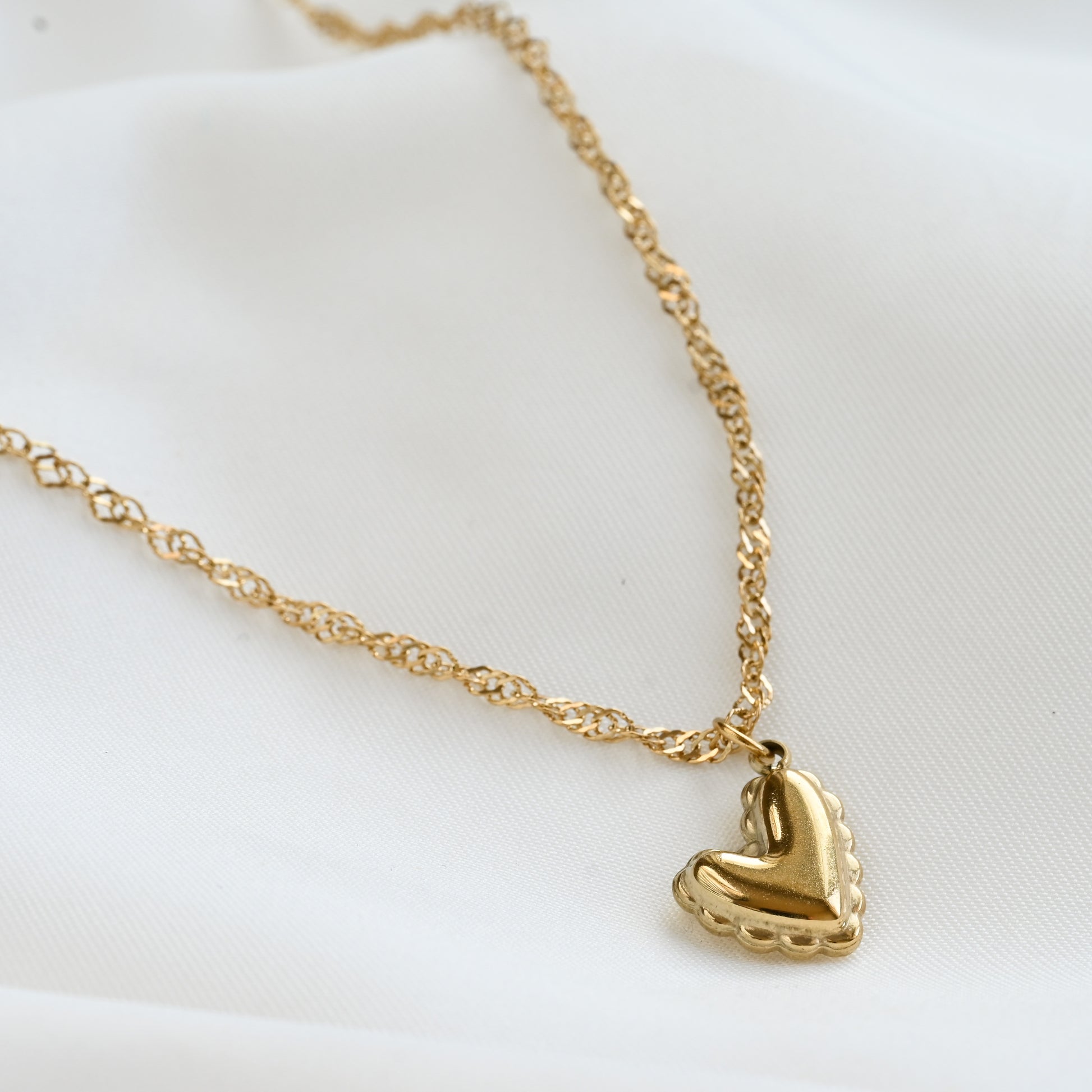 Heart pendant necklace on a stainless steel dainty Singapore chain. The chain is 18" with a 2" extender and is waterproof for daily wear.