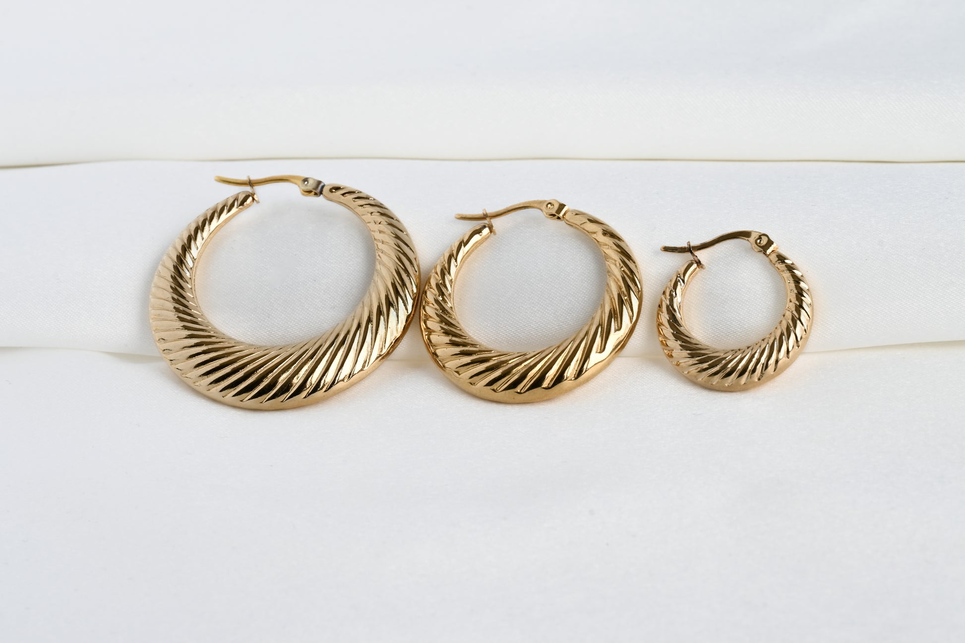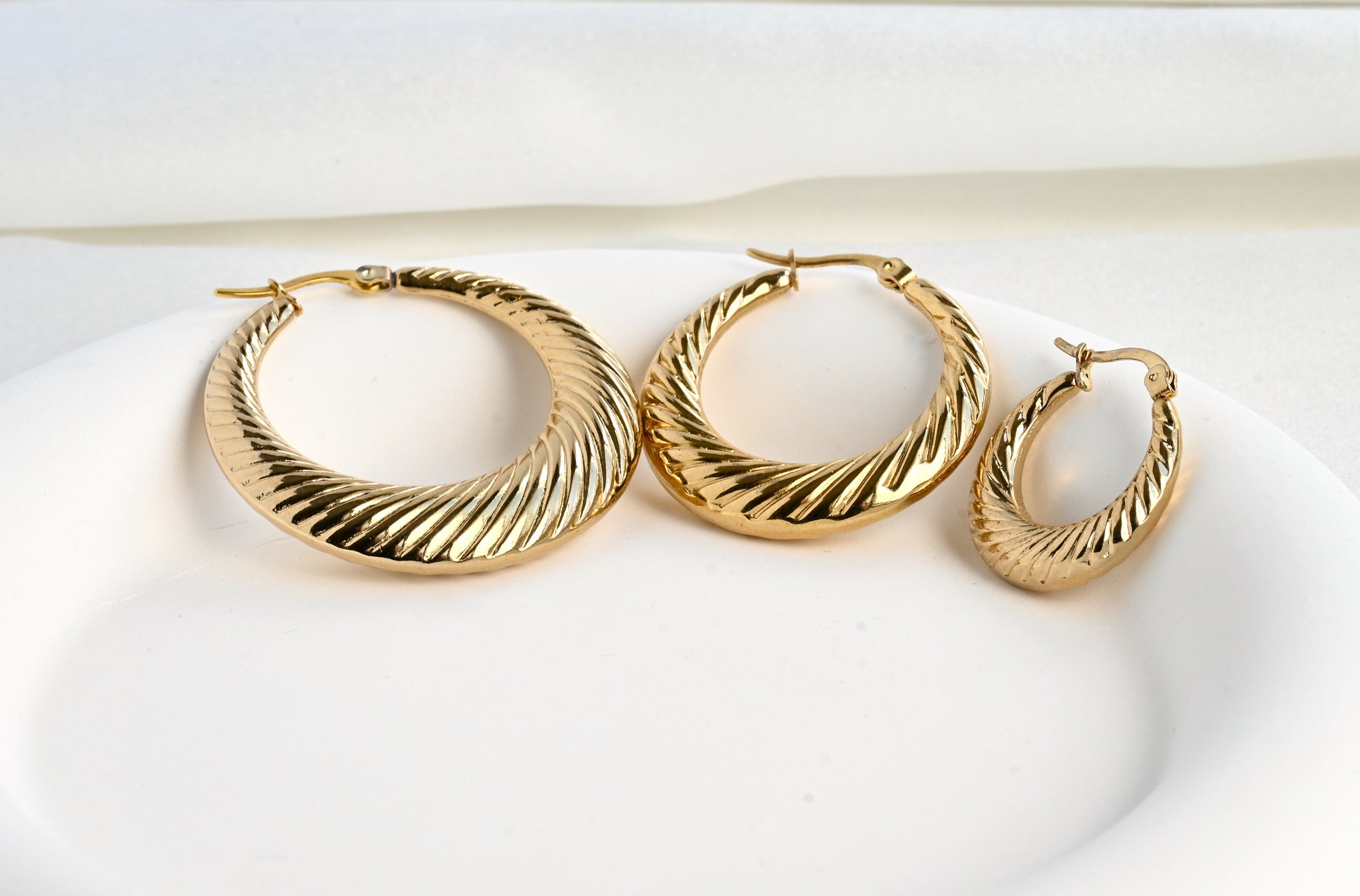 Handcrafted in stainless steel and PVD plated in 18k gold, our lightweight croissant hoops will last forever! These chunky crescent hoops come in three sizes (20 mm, 35 mm and oversized 40 mm) to choose from and offer a bold sparkle.