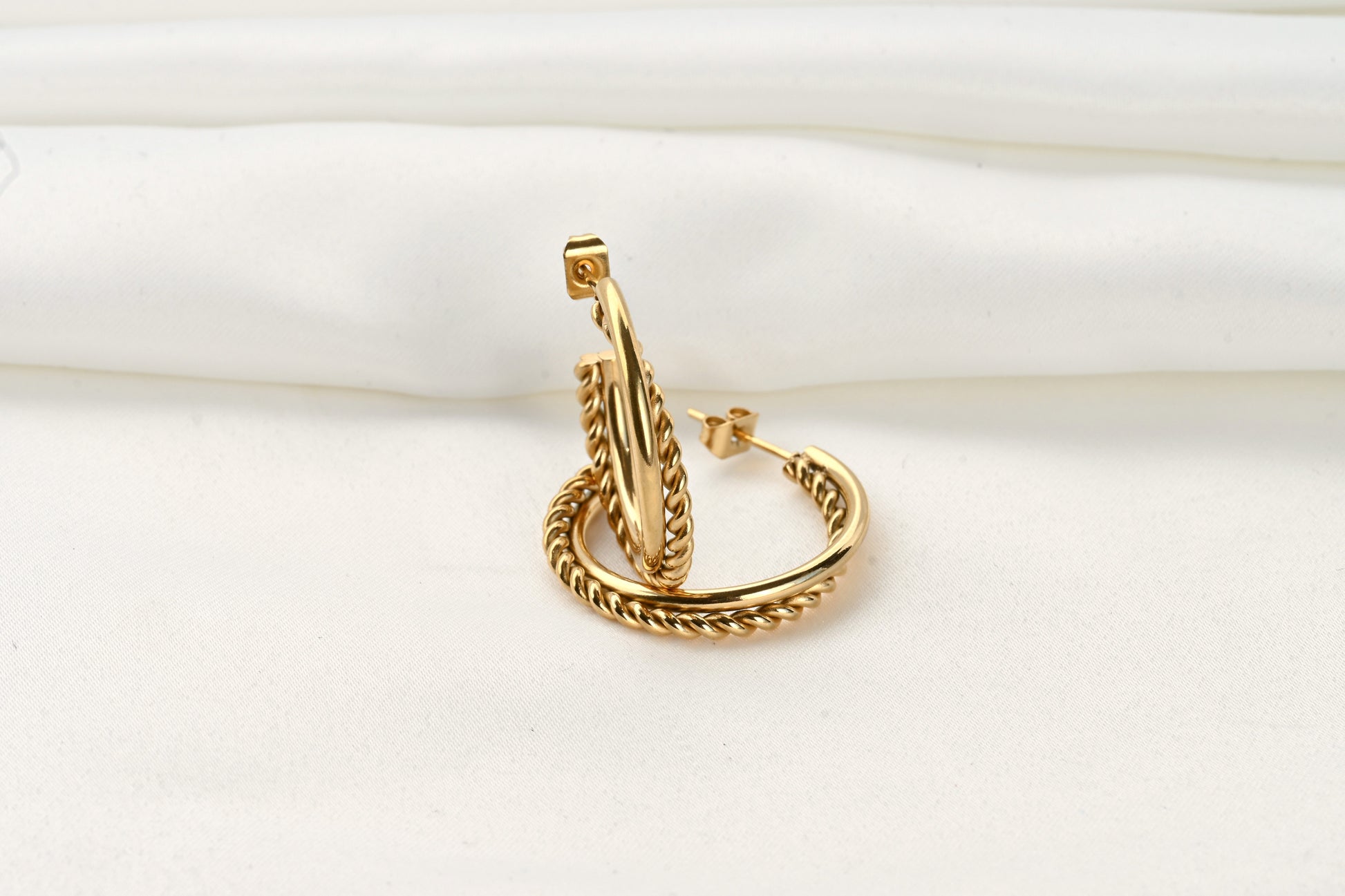 Classy and dainty in design, these medium sized twisted hoops are made of 18k Gold PVD plated stainless steel and have a diameter of 27 mm. The open design features twisted sleek and rope hoops that complement each other so well! They will fit just about any outfit. Plus, they are tarnish resistant and waterproof; you can wear them to the pool or gym and they won't tarnish.