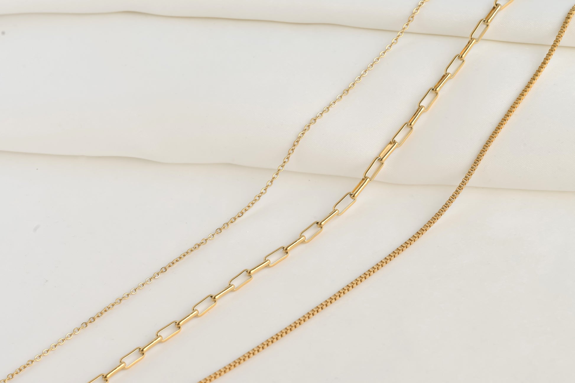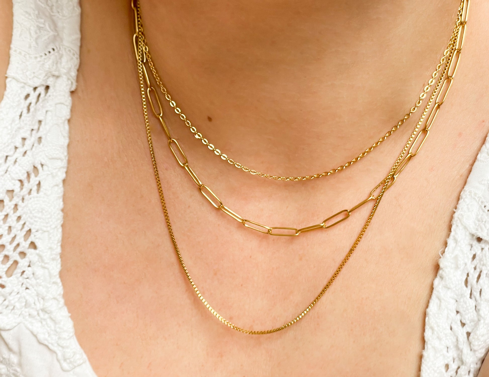 The geometry and the three layers together bring out the sophistication of this design. Chic and classy, this three pieces gold necklace set is a playful touch to your look. The design features a 14" cable chain choker, a 15.5" paperclip chain as its focal point and an 18" box chain.