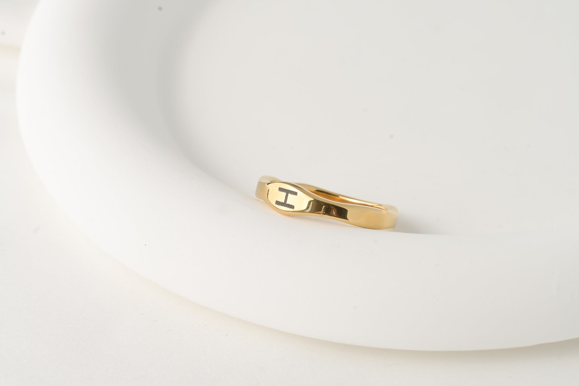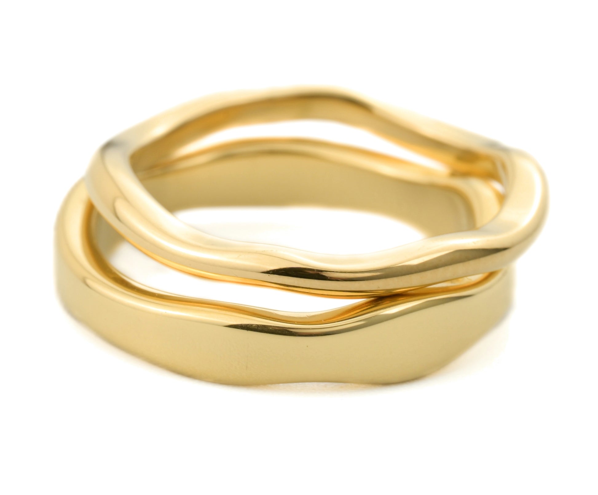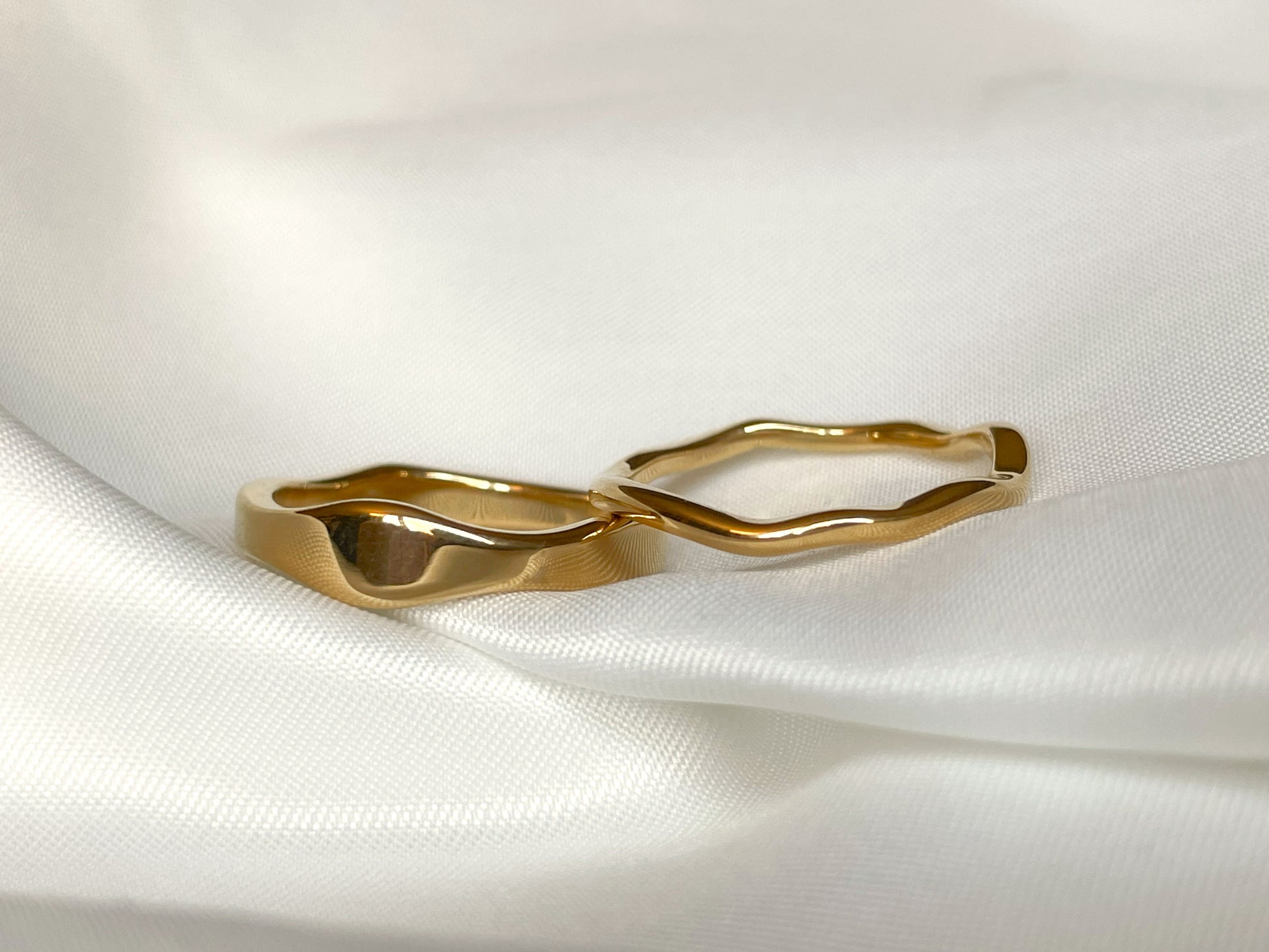 A stacker statement ring for everyday wear. Handcrafted in 18k gold filled stainless steel, this design features thin and thick irregular patterned bands inspired by ocean waves. Have this ring as a set of 2 or just keep it simple and wear only band! Available in sizes 5, 6, 7, 8, and 9.